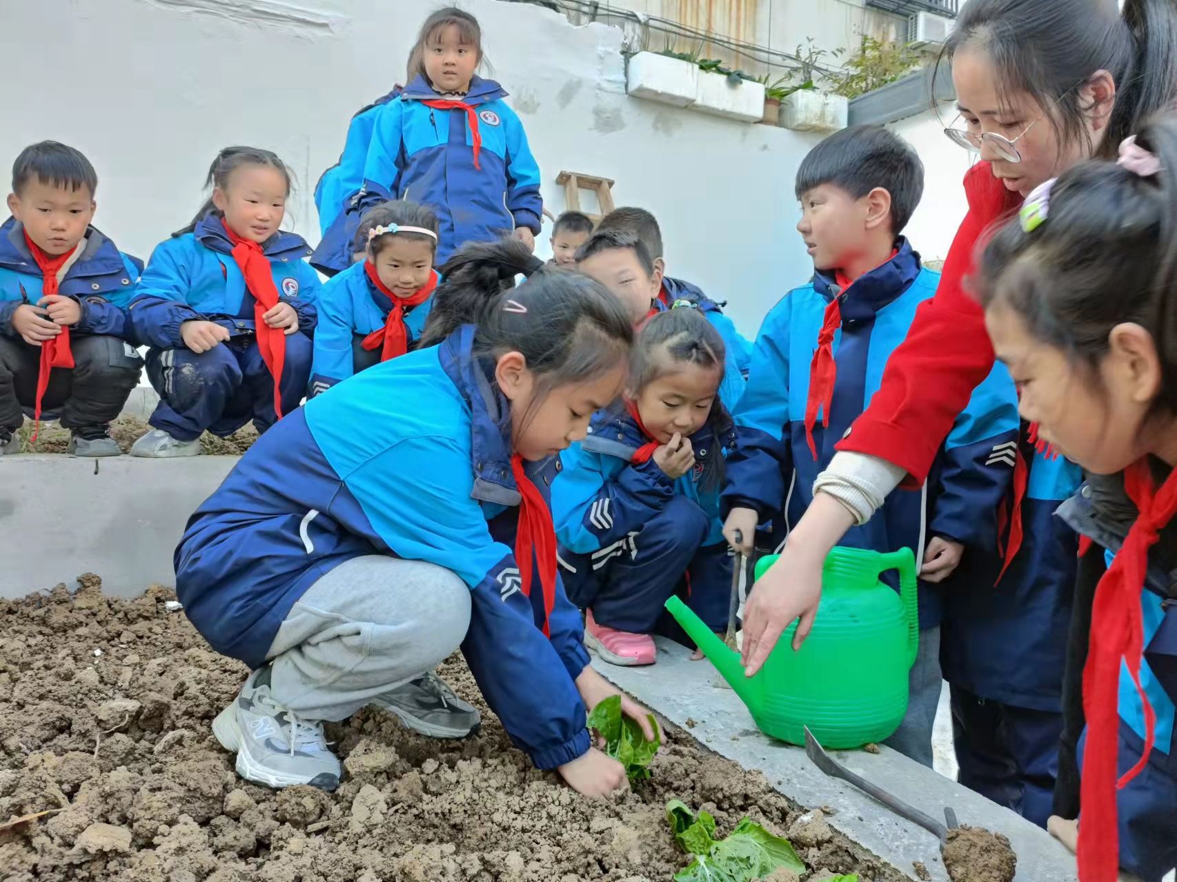 在综合实践课老师的带领下,二(1)班的同学们来到劳动教育实践基地开始学习种植蔬菜。张老师首先讲解了栽种要领并亲自示范。接着,手把手指导学生栽种。同学们本来对农活很陌生,渐渐地开始得心应手起来。大家都是第一次下地劳动,鞋子上沾满了泥巴,但她们依旧在认真完成分配的任务。当栽完蔬菜时,同学们看着自己的劳动成果,都感到自豪和开心。