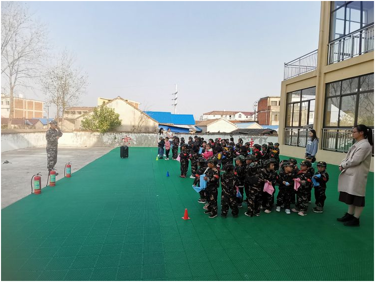 长颈鹿教官结合幼儿园实际,给师生介绍灭火器以及灭火器正确的使用方法,并指导孩子们在发生火灾时如何正确的利用消防标识逃生,针对火灾时逃生的动作要领和注意事项、如何正确的拨打119、灭火器的用途等进行讲解。