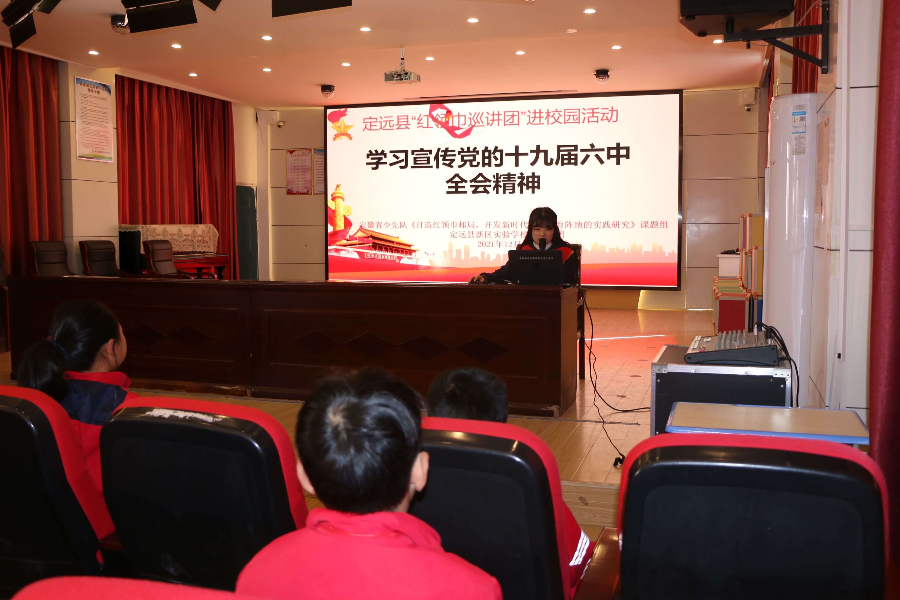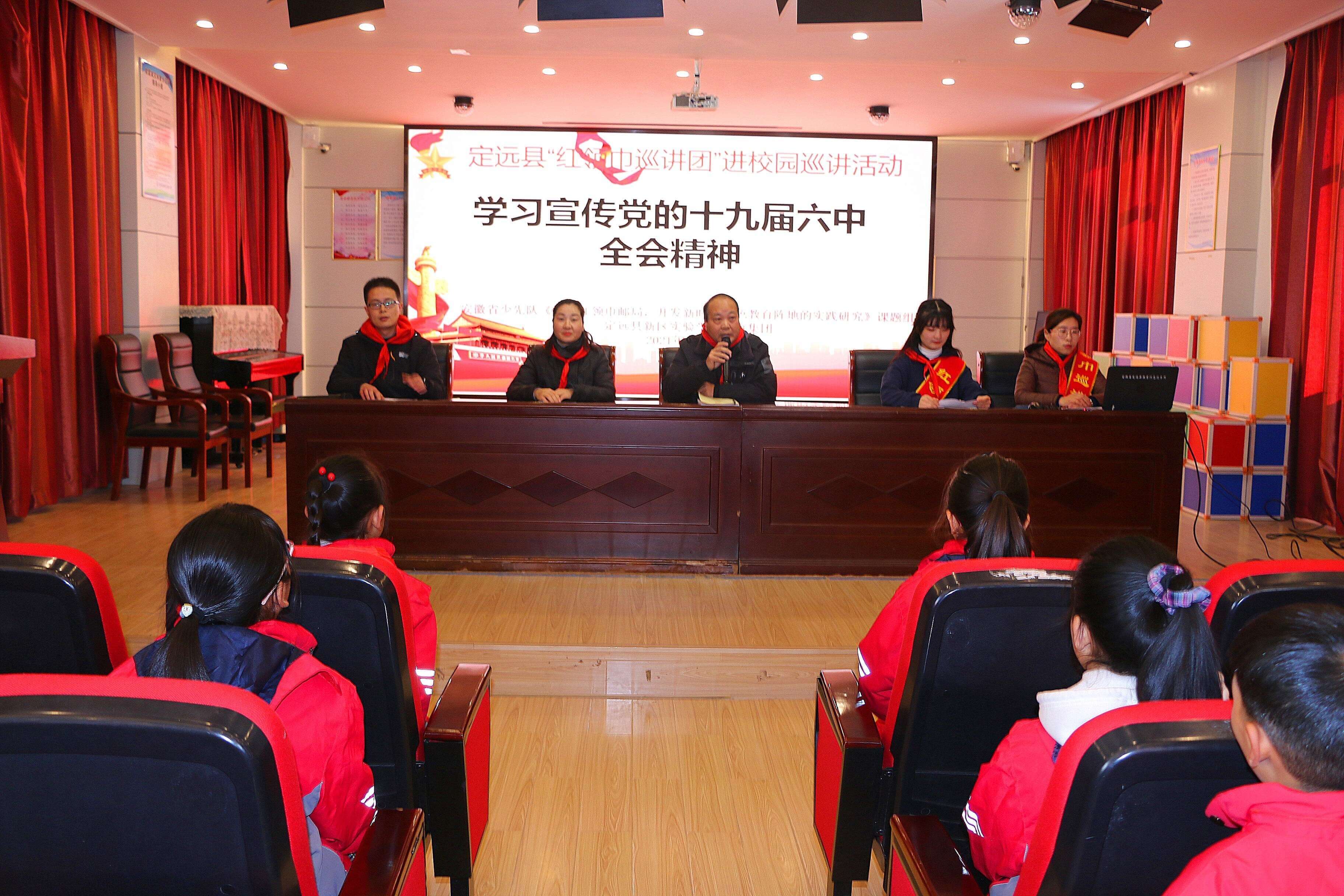 12月1日,定远县新区实验学校教育集团“红领巾巡讲团”在新区实小校区多媒体报告厅为少先队员宣讲党的十九届六中全会精神。本次宣讲活动由定远县红领巾巡讲员孙瑜、耿莹明两位老师宣讲。