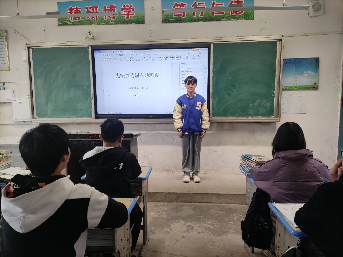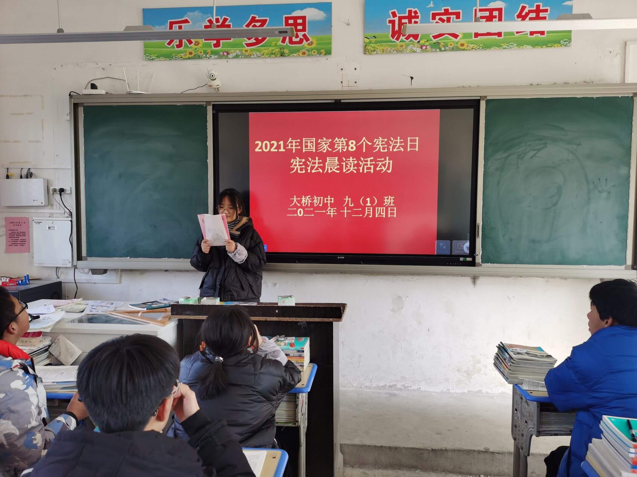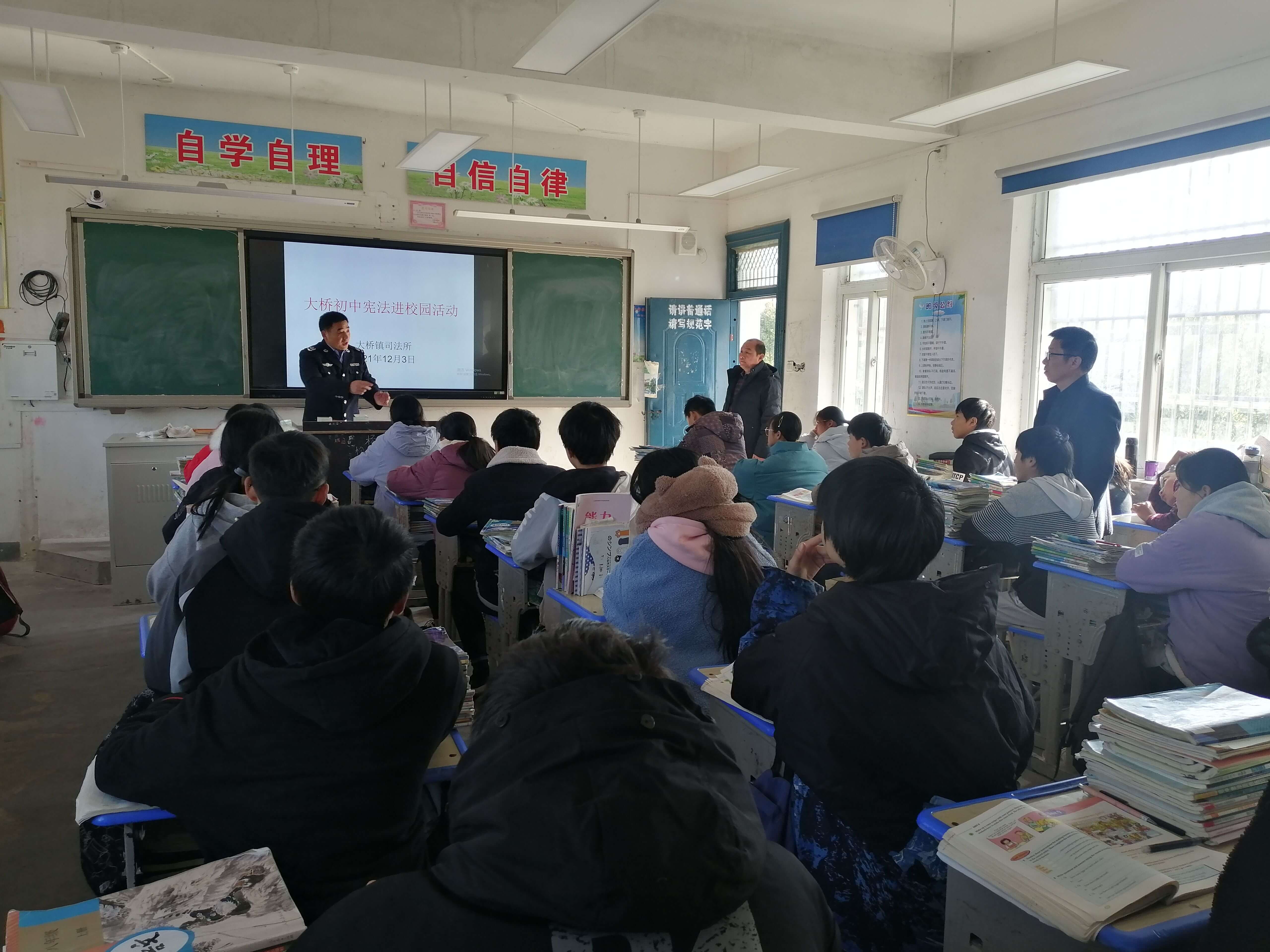 本次宪法宣传活动,大桥初中开展了各项有意义的活动。首先,召开了教师例会,校长许培铜,在会上发表讲话,普及宪法知识。其次,各班级通过晨读主题班会、黑板报等多种形式积极宣传宪法知识。第三,大桥镇司法所的同志,亲临班级,向学生们普及宪法内容及意义。第四,大桥镇司法所向大桥初中捐赠宪法书籍若干。