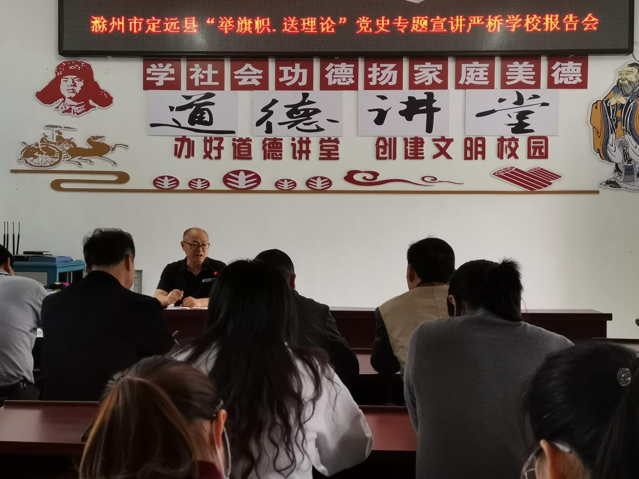 ~ 为深入学习贯彻习近平总书记在党史学习教育动员大会上的讲话精神,严桥学校党支部多措并举扎实推进党史学习教育。5月11日,严桥学校党支部“举旗帜·送理论”党史专题宣讲报告会在综合楼一楼举行,全体教师参加会议。