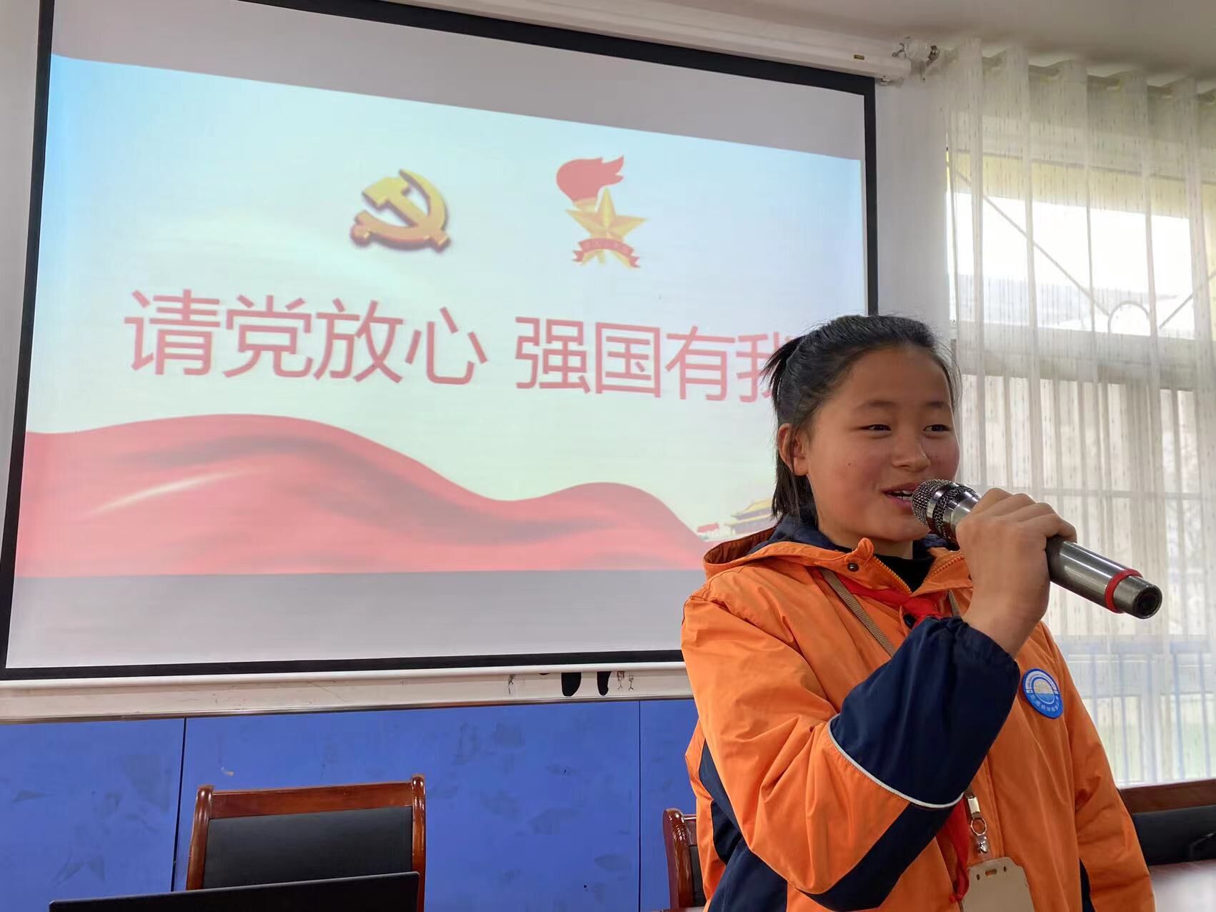 ~ 本次宣讲活动的主题是“请党放心 强国有我”,宣讲活动由定远县红领巾巡讲员孙莉老师和徐颖同学宣讲。学校党支部书记、校长冯军熙作了动员讲话。宣讲员孙莉老师宣讲了《中国共产党第十九届中央委员会第六次全体会议公报》的主要内容,介绍了百年奋斗的历史意义、十八大以来取得的历史成就等,让少先队员了解党在百年间的艰苦奋斗的不易,从心底热爱党、热爱祖国、热爱人民,铸就学生坚定牢固的红色灵魂。徐颖同学,用自己的语言向广大同学宣讲党的十九届六中全会精神,讲述党的故事、革命的故事、英雄的故事,让同学们更加深入全面了解伟大的中国共产党,从内心感悟今天幸福生活的来之不易,从而坚定知党史、感党恩、跟党走的决心和信心。全体同学慷慨激昂的一句誓词“请党放心 强国有我”,激起队员们的昂扬斗志,“时刻准备着”的呼语道出了在场队员的报国决心。