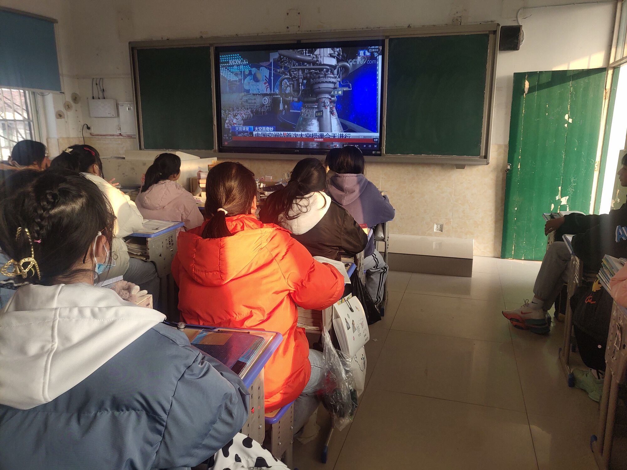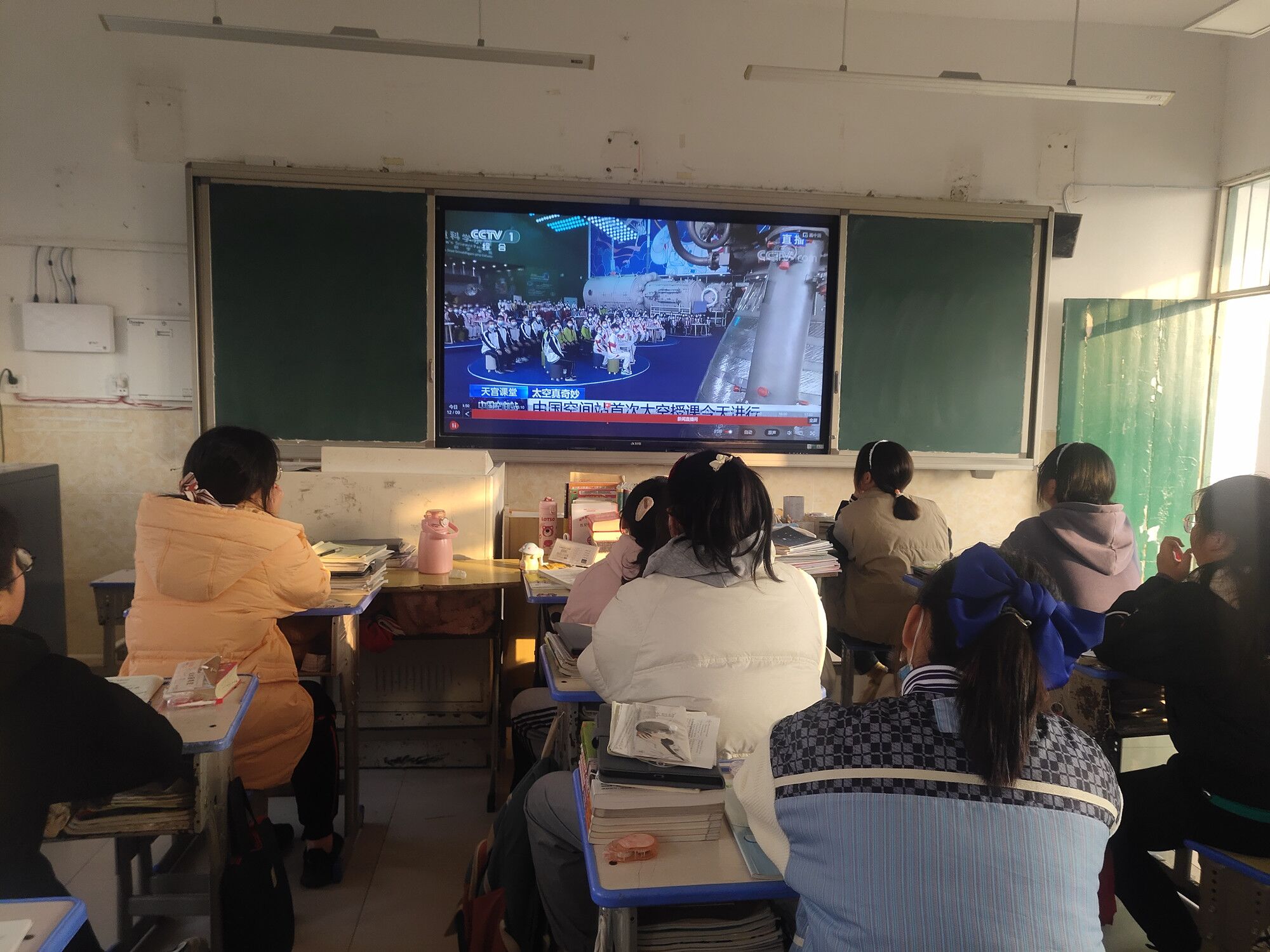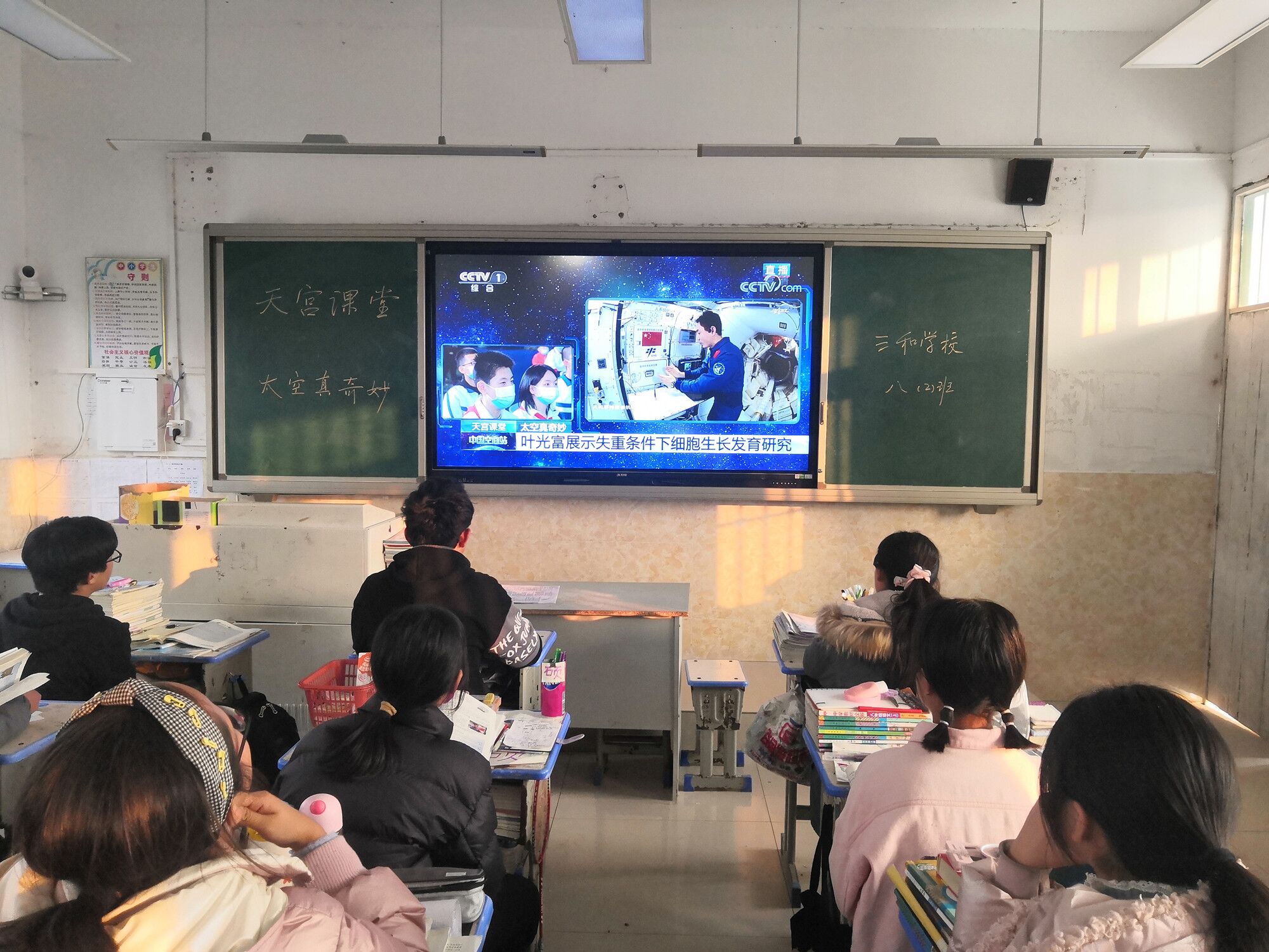 12月9日下午3:40,定远县三和学校一至九年级各班准时打开央视网直播频道,500名学生一同进入“天宫课堂”,在“太空教师”翟志刚、王亚平、叶光富带领下,参观我们的太空家园,感受“太空真奇妙”!
