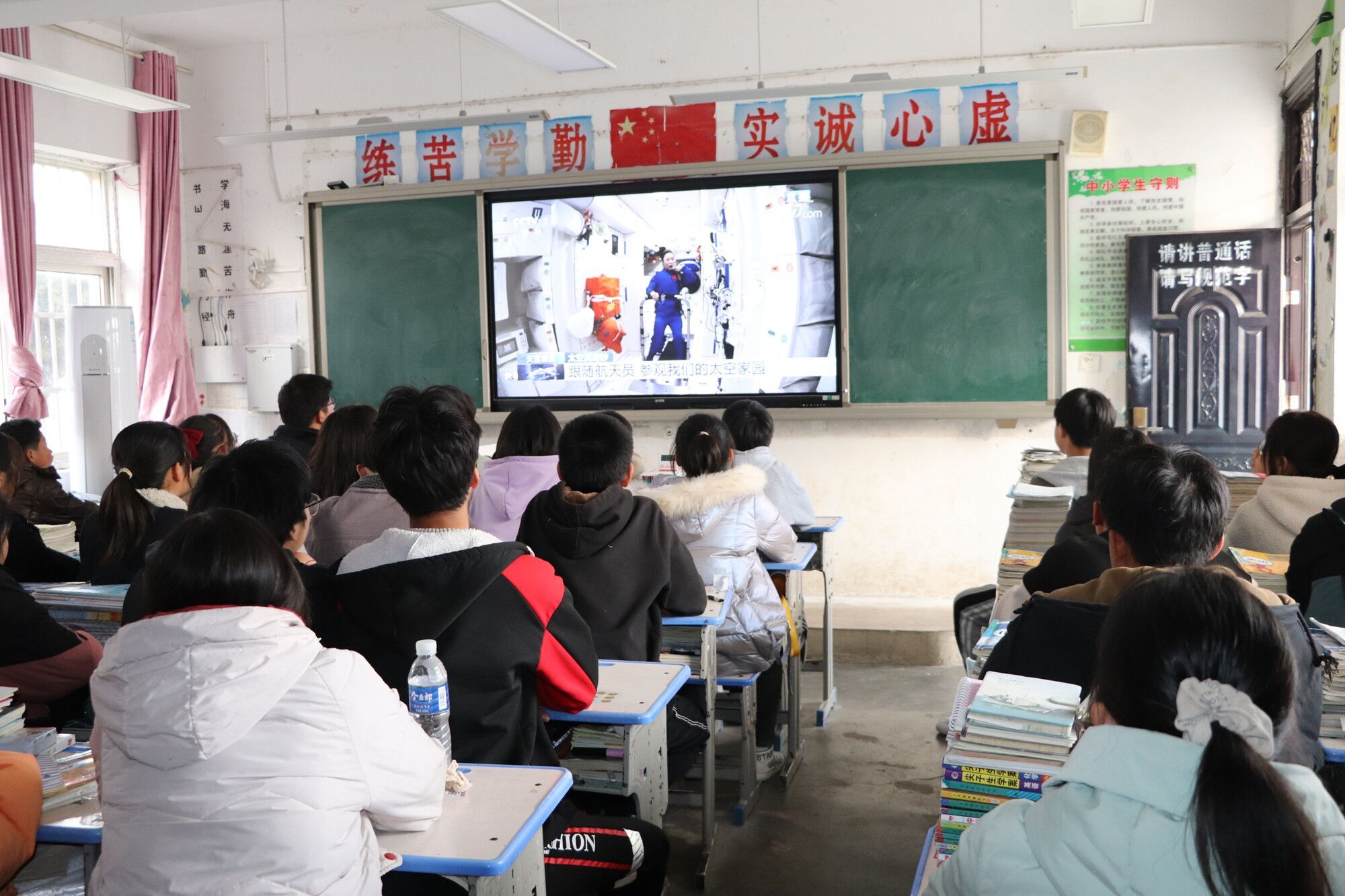 12月9日15:40,“天宫课堂”第一课盛大开课,定远县天河初中同学们准时赴约,在教室内观看中央广播电视总台现场直播,同上这堂精彩无比神舟十三号乘组航天员翟志刚、王亚平、叶光富在中国空间站进行太空授课。