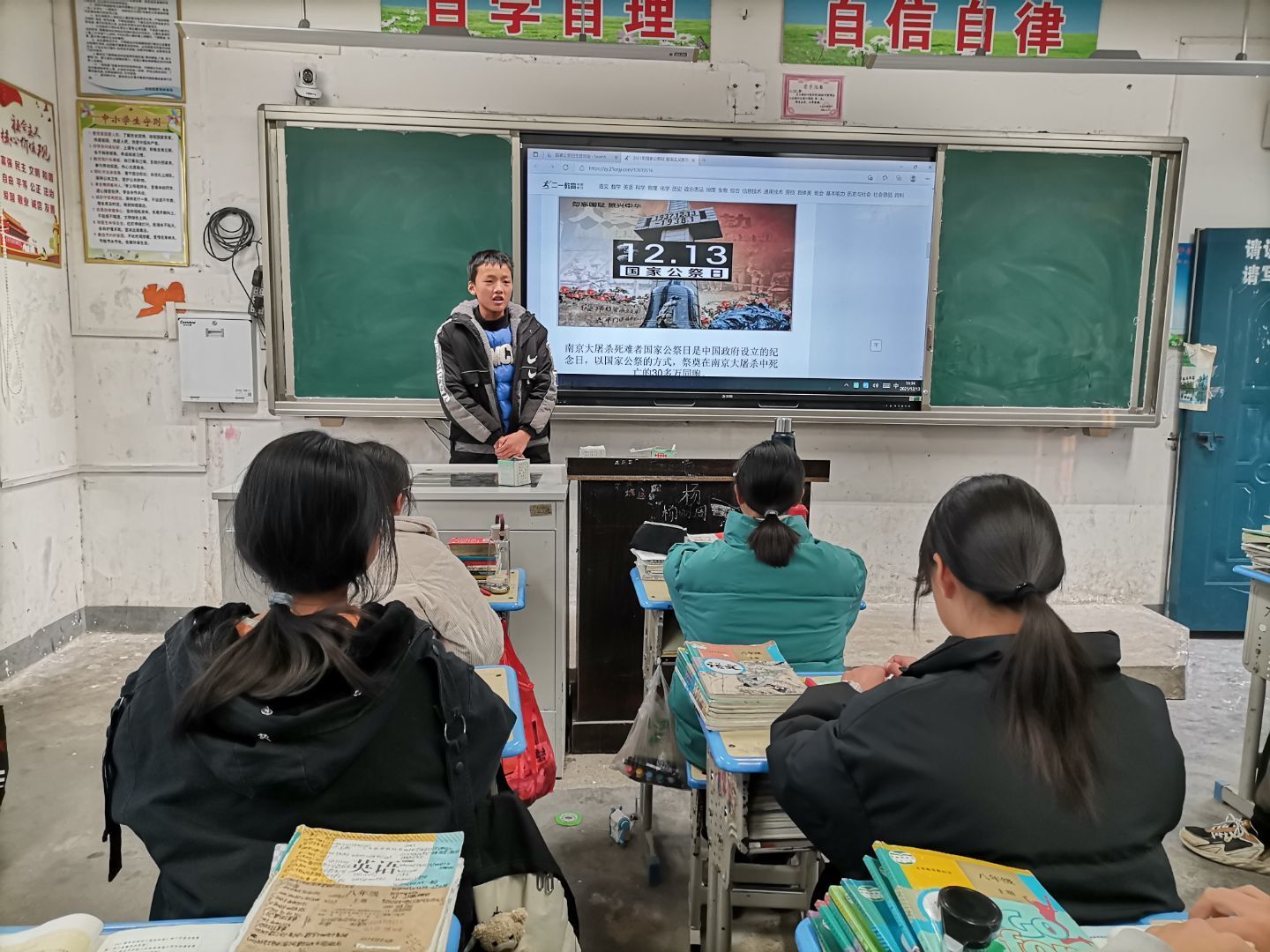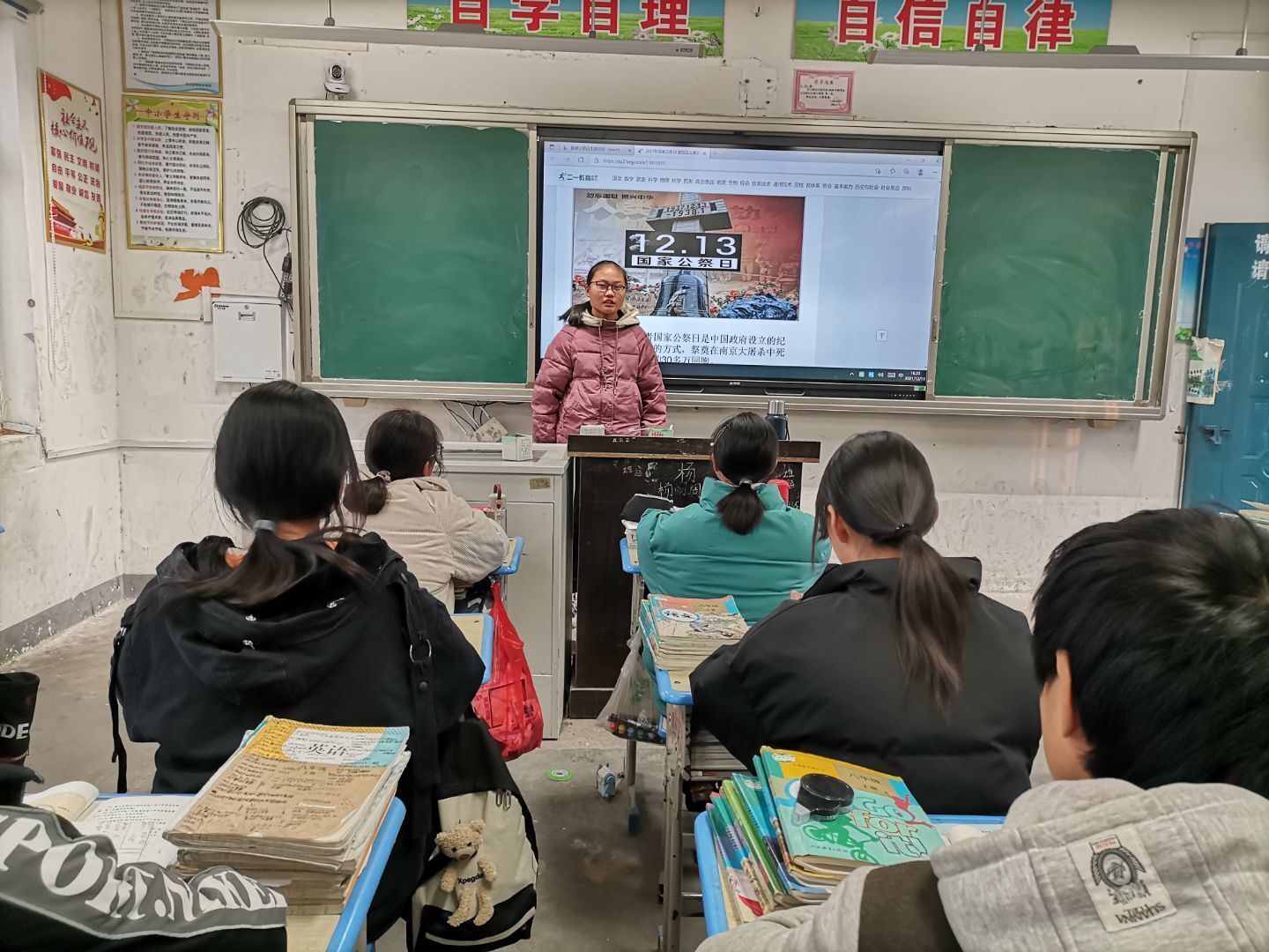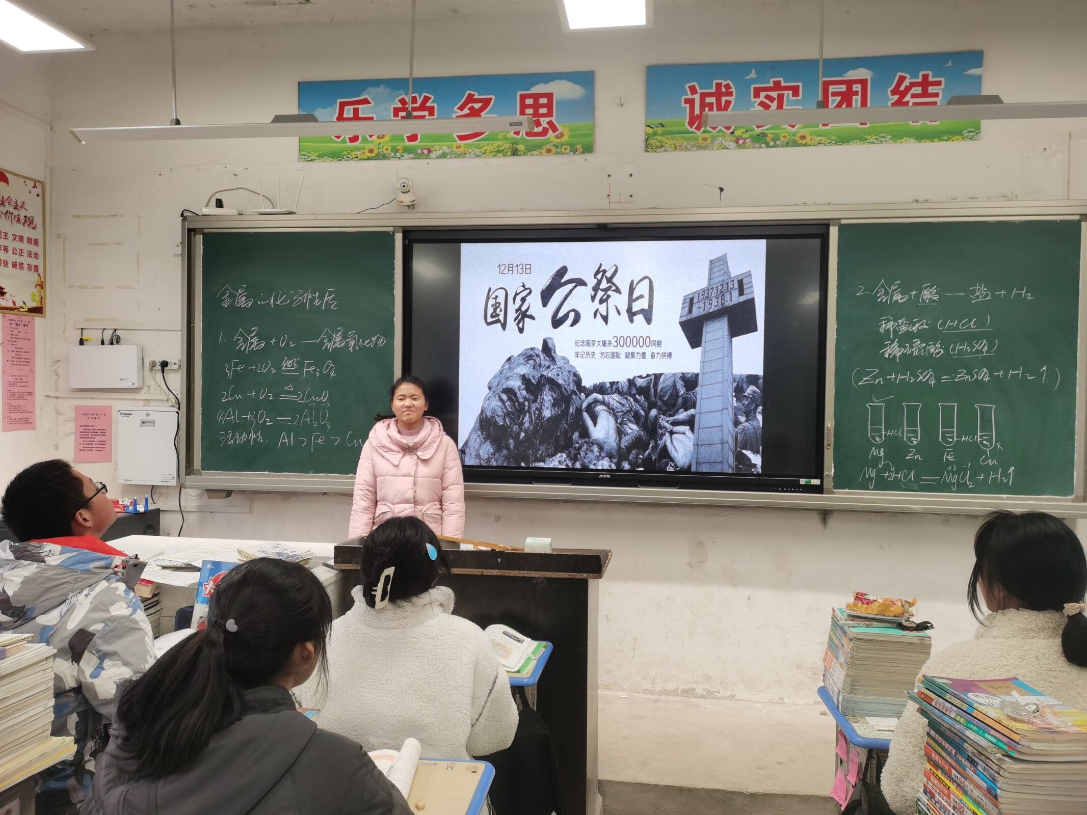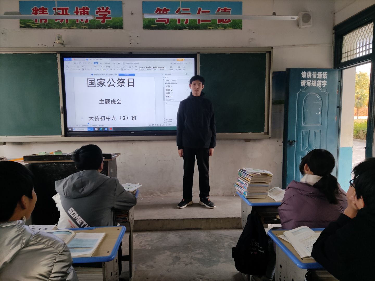 12月13日,是南京大屠杀公祭日。大桥初中开展了系列主题教育活动。在升国旗时,升旗手进行国旗下的爱国演讲。校长许培铜,带领全体师生,垂首为遇难同胞默哀,深切悼念在南京大屠杀和日本侵华战争中,遇难的同胞们,寄托民族哀思。各班班主任,召开主题班会,组织孩子们观看视频,让他们了解南京大屠杀这一历史事件的残酷真相。