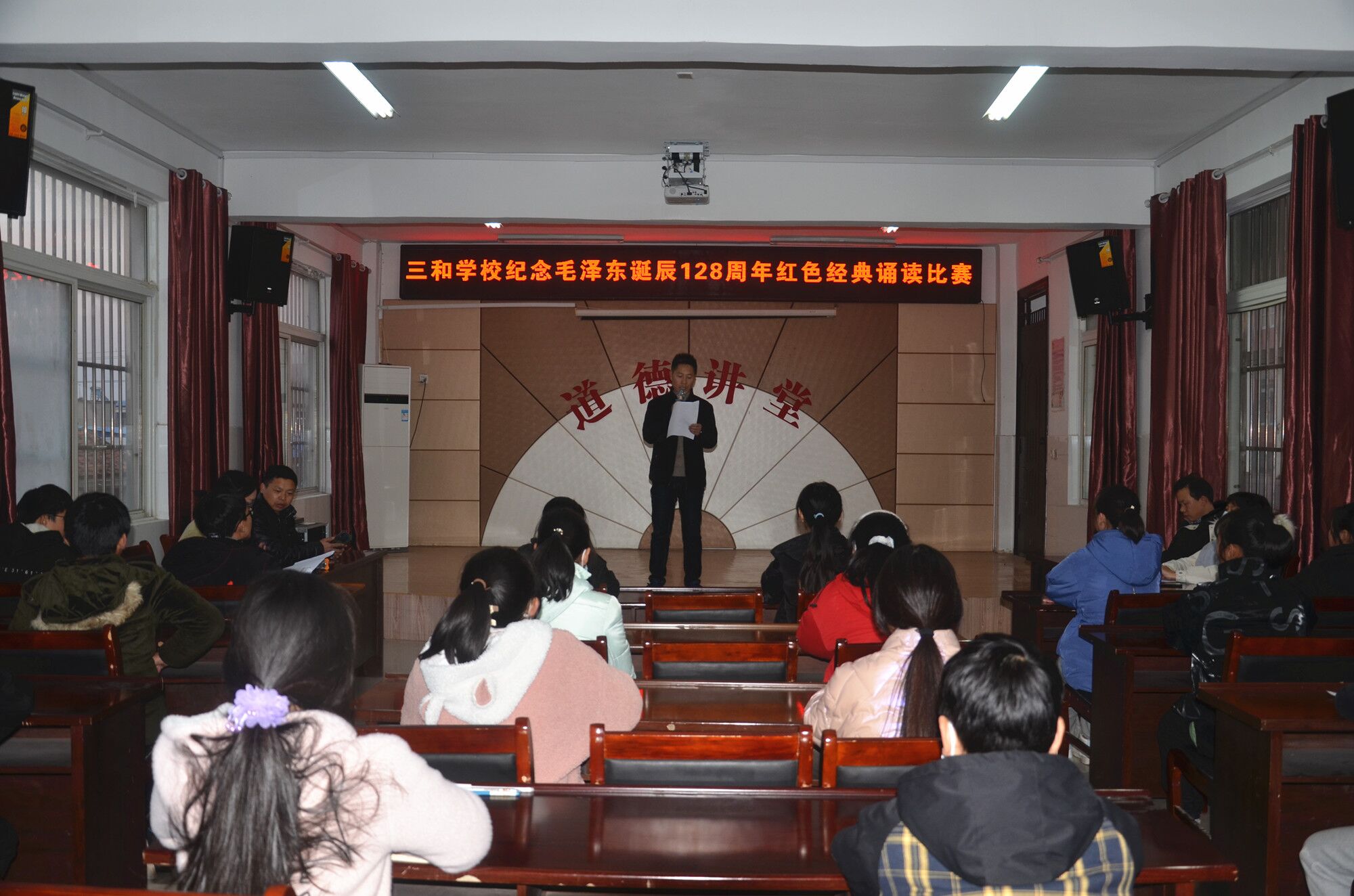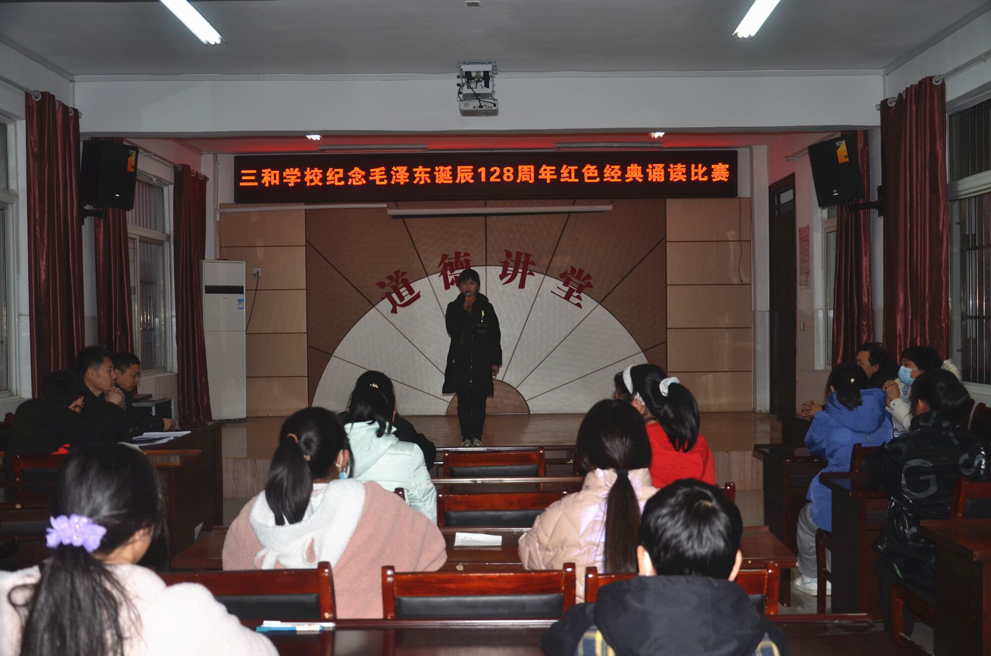 2021年12月26日是伟大领袖毛泽东诞辰128周年纪念日。为了缅怀伟人的丰功伟绩,弘扬伟大中华民族精神,进一步在青少年学生中开展红色文化教育,厚植爱国爱党情怀,12月22日,定远县三和学校在少年宫道德讲堂举行纪念毛泽东诞辰128周年红色经典诵读比赛。活动由校团委主办,该校课后服务经典诵读兴趣小组全体同学参加活动。