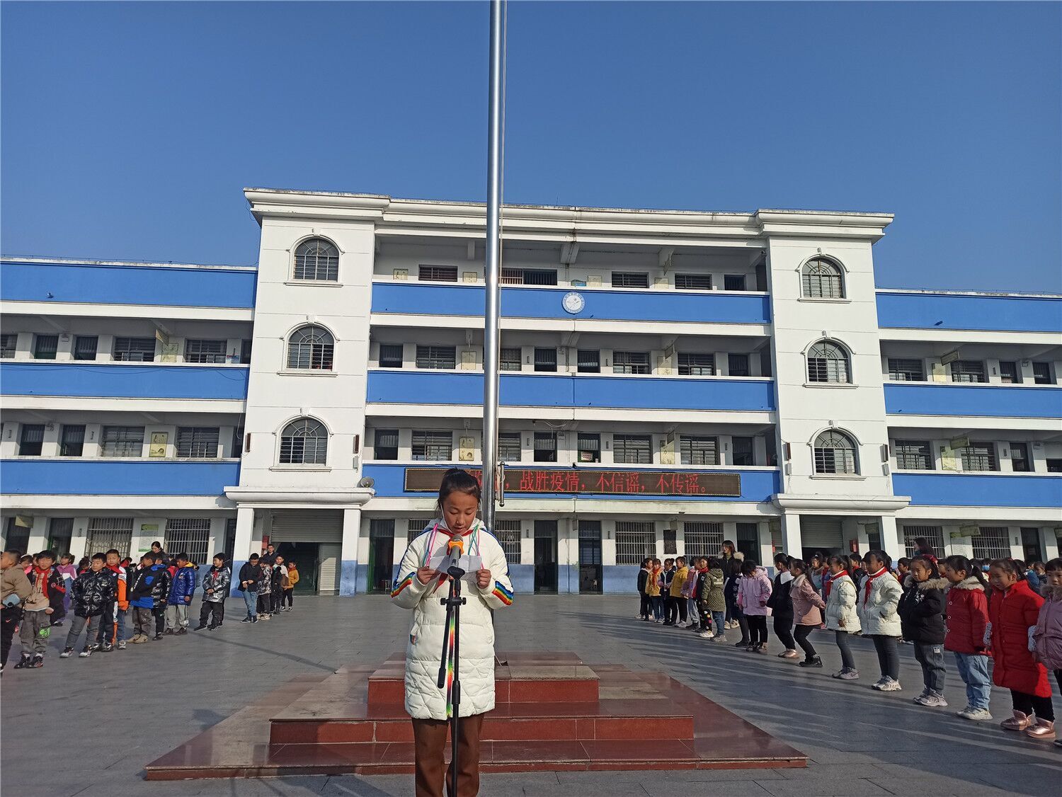 ~ 在升旗仪式上,全体师生肃立,四(3)中队钱香凝以“铭记历史 勿忘国耻”进行主题讲话。一起回顾1937年那段惨烈历史并为死难同胞默哀。各中队开展了主题班队会活动,观看了相关的影视资料,了解了南京大屠杀的悲痛岁月。