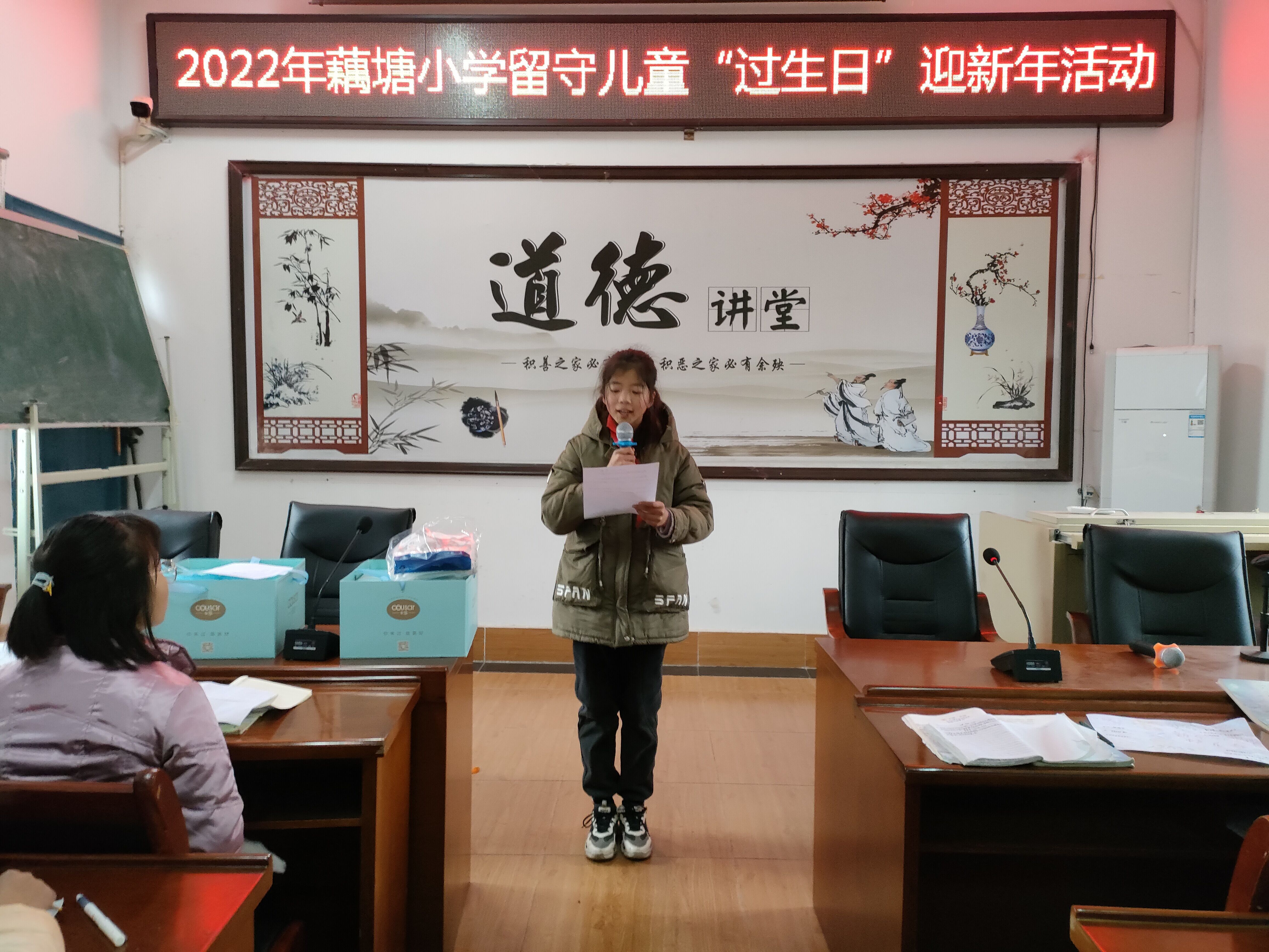 活动伊始,分管领导出席发言,他表达了对全体留守儿童的关心关爱,并祝福他们新年快乐、健康成长。接着,学生代表发言,她代表全体留守儿童对学校领导、老师的关爱致以衷心感谢,并号召同学们新的一年继续努力奋斗,孝敬父母,报答师恩,报效社会。