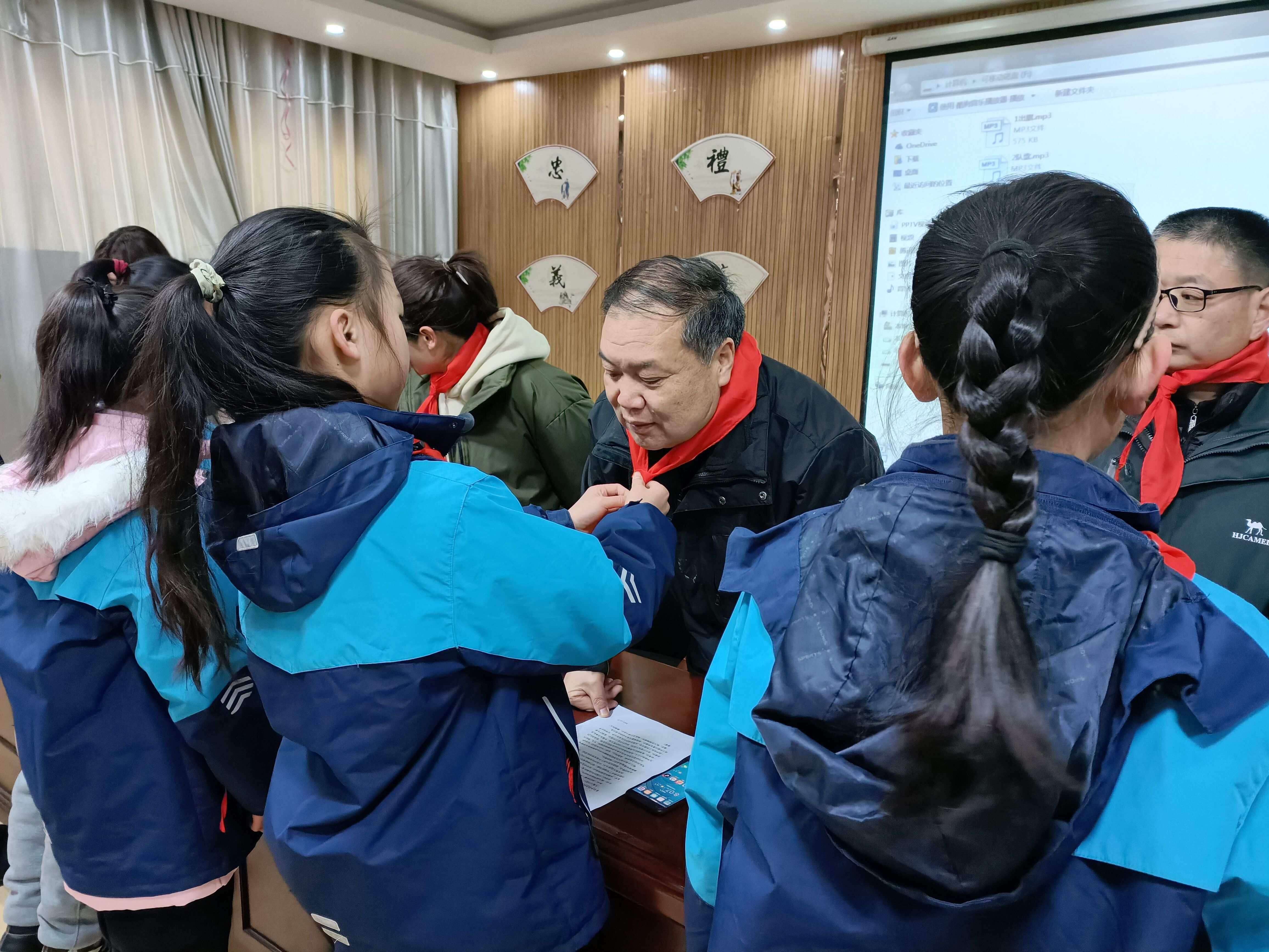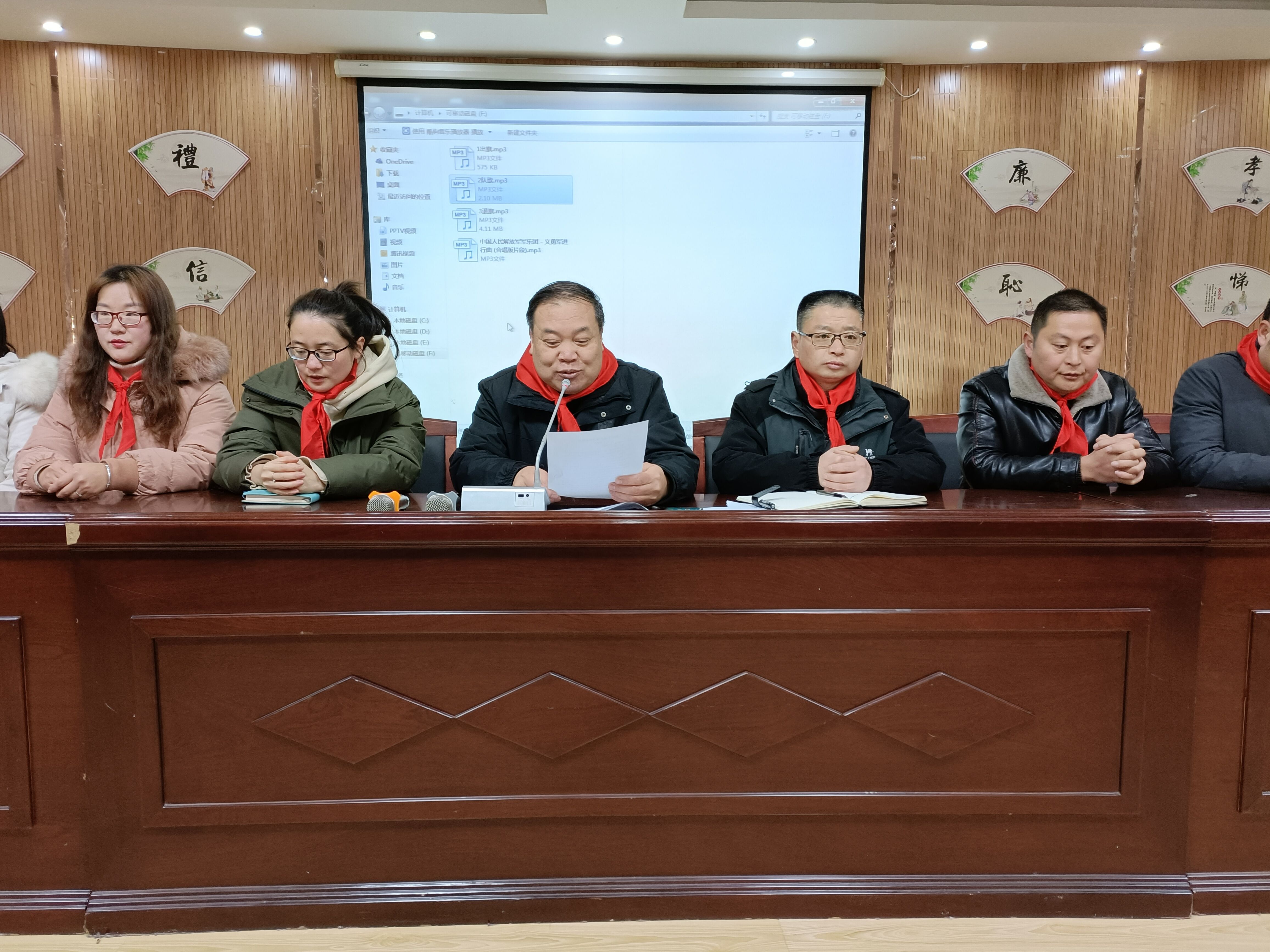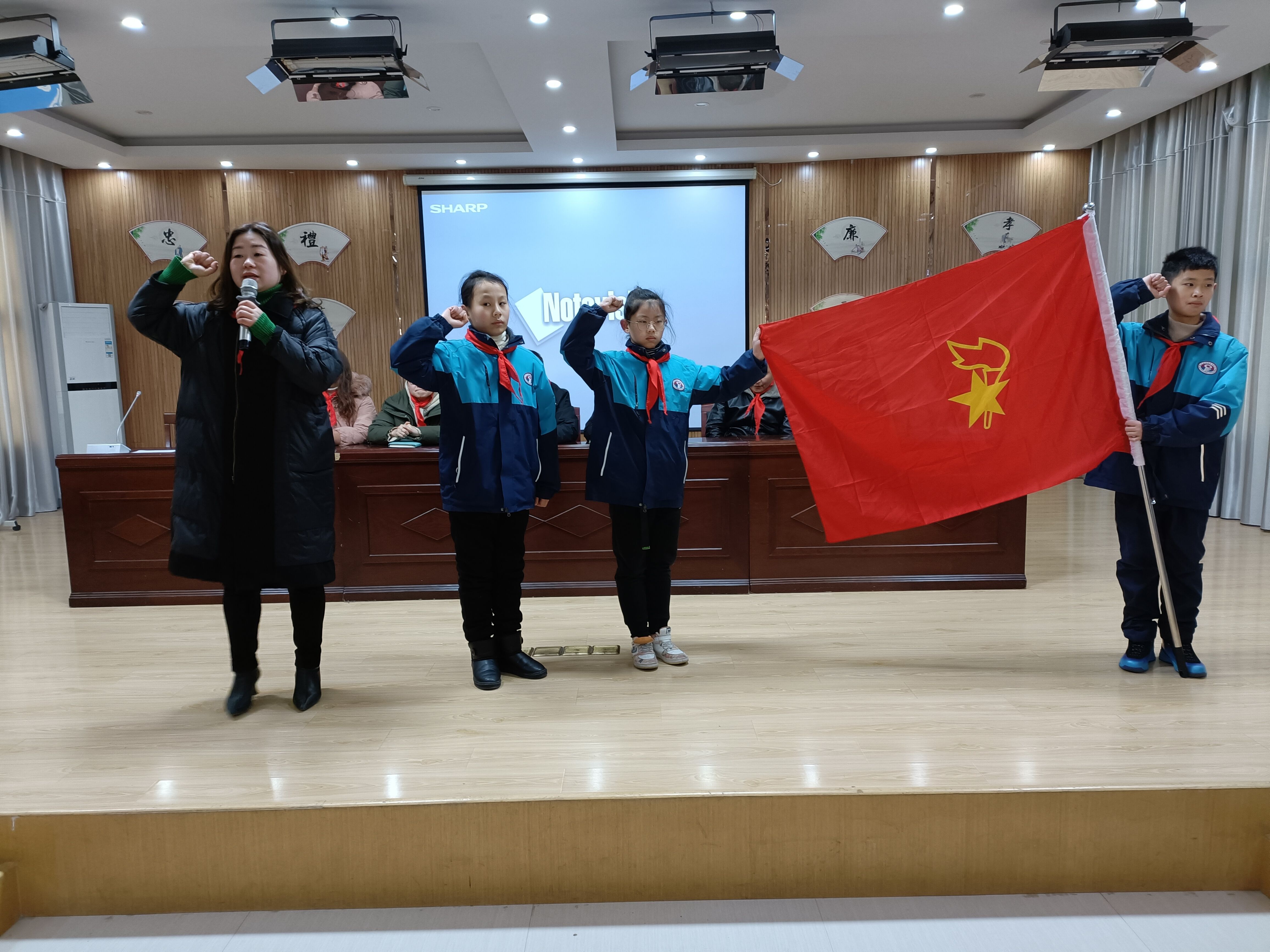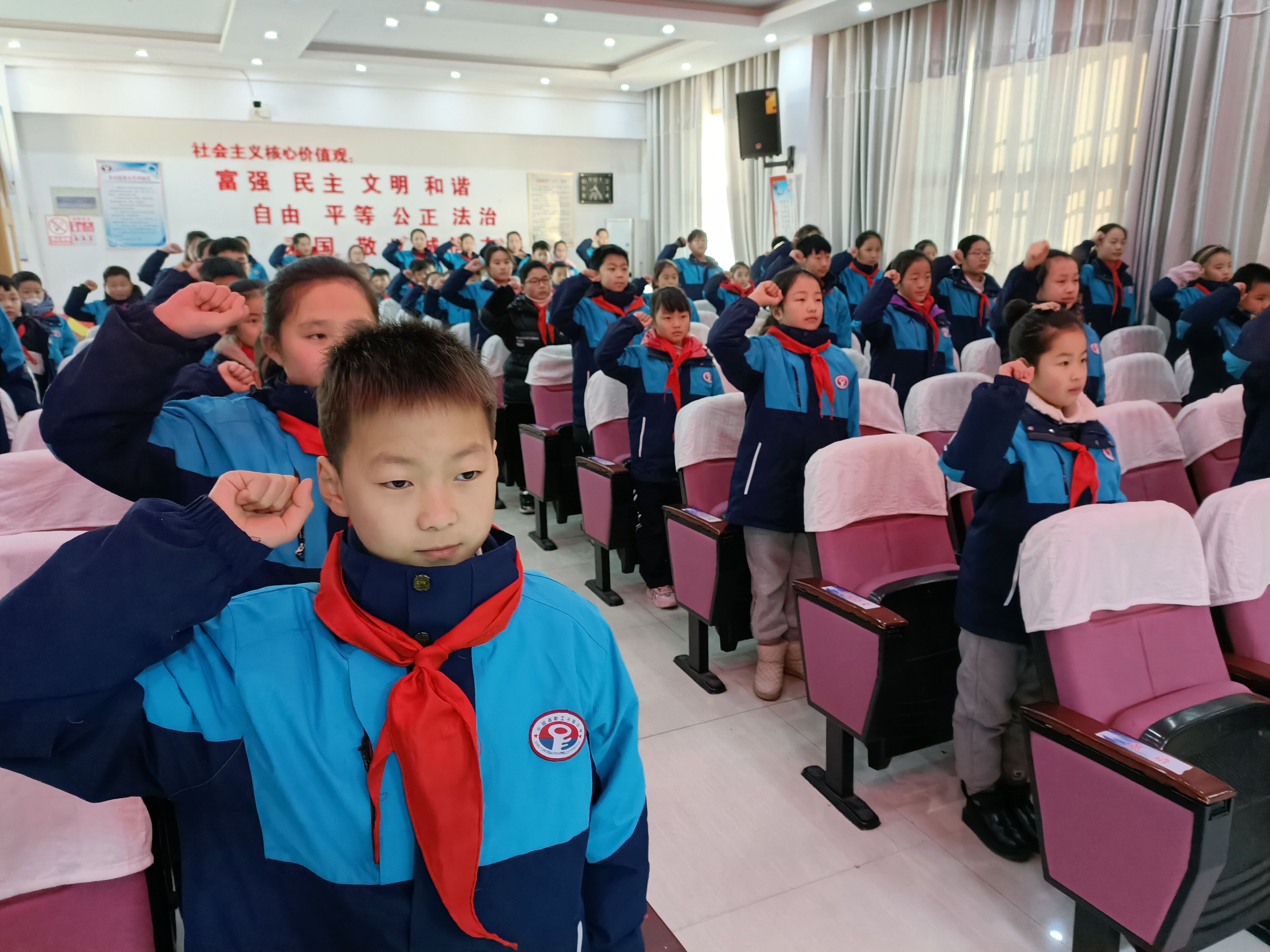 会上,在队歌声中优秀少先队员们为出席本次大会的校领导、学生家长、辅导员、学生代表佩戴鲜艳的红领巾。全体少先队员起立齐唱《中国少年先锋队队歌》,优秀少先队员为大会献词,真挚的话语,代表学校少年儿童向大会表达最美好的祝愿!