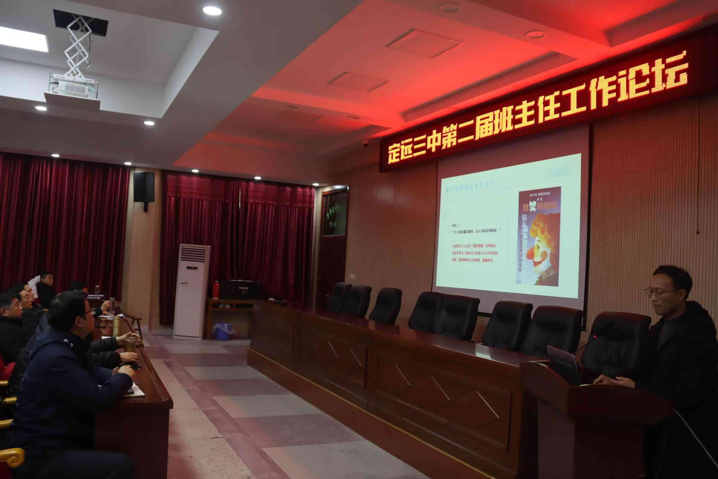 1月9日上午,定远三中第二届班主任工作论坛在科学馆报告厅顺利举办。学校党委书记、校长余荣等学校党政领导班子成员和来自三个年级的65名班主任共同参加了本届论坛,论坛活动由政教处副主任何陈志主持。