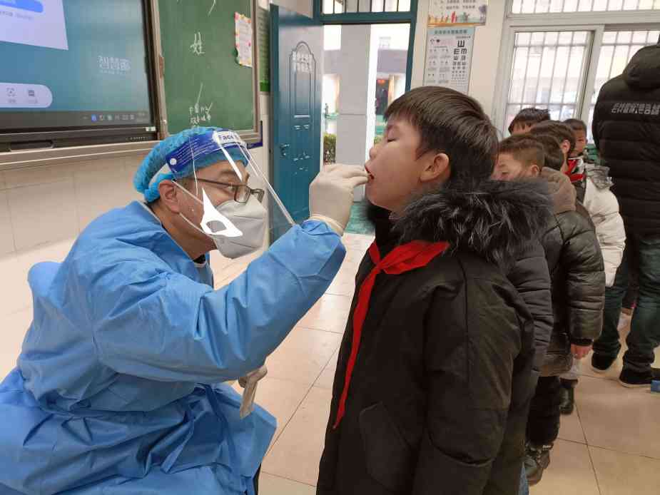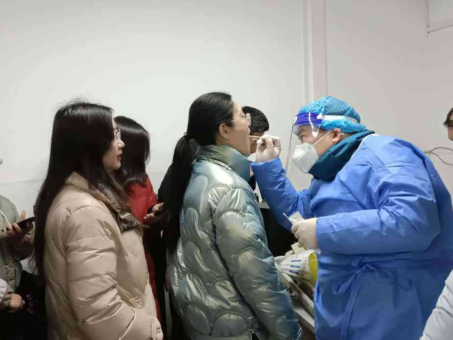 ~ 检测中,医护人员身穿密不透气的防护服,首先为全体教师作核酸检测。接着,医护人员逐班逐个为学生采集咽拭子。在采集口咽拭子时,同学们头部微仰、嘴巴张大,由医务人员采集咽部上皮细胞标本并保存,采集完成后,在老师们的指引下,学生们有序地回到座位。