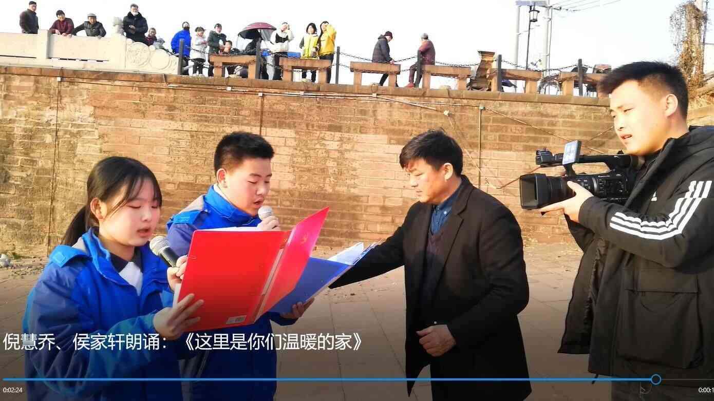 ~ 在下午朗诵快闪活动中,池河中学团委选派八(1)班倪慧乔和候家轩两名优秀朗诵者参加此次活动,活动在有600多年的古桥太平桥上进行。倪慧乔与候家轩朗诵的作品由定远朗读者协会成员杜卫国先生专门为池河中学创作的诗歌《这里是你们温暖的家》。他两朗诵时嗓音纯粹,感情质朴而真诚,时而深情款款,时而平缓克制,时而抑扬顿挫,时而高亢激昂。朗诵中,他两将对学校的爱、对池河的爱融入到每个字、每句话中,精彩的朗诵,赢得现场观众阵阵掌声和高度赞扬。