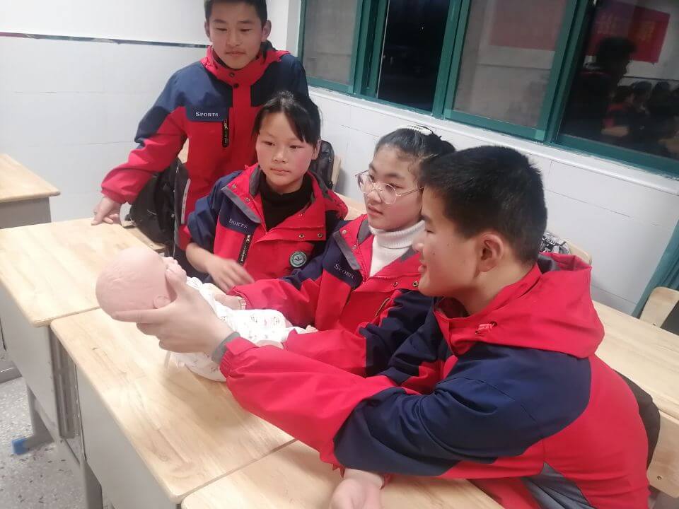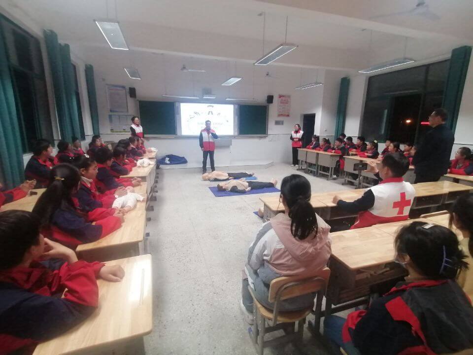 ~ 在理论知识讲解的同时,红十字志愿者利用模型对心肺复苏的标准动作及流程进行了生动规范的同步演示,理论与实践相结合,生动直观,易于理解掌握。讲授现场,学生们就心肺复苏进行了体验操作,红十字志愿者对学生的每一个动作逐一进行了规范的指导,现场气氛热烈,学生们学习兴趣浓厚,取得了较好的宣讲效果。每位留守儿童都亲自体验操作,增加了自救互救意识,学习心肺复苏术的技能。