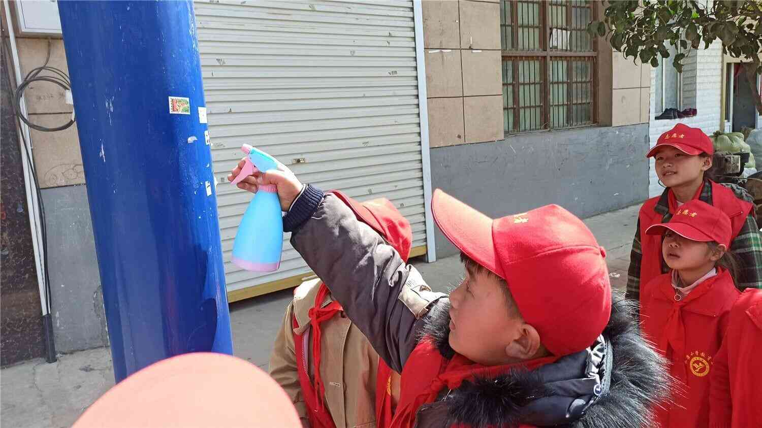~ 志愿者服务队走上街头,清理墙上的小广告。他们拿着小铲子,拎着小桶和“城市牛皮癣”斗智斗勇。少先队员们三五人一组,分工明确,有的在用小铲子清理小广告,有的在清扫落下的纸屑。清理完小广告后,少先队员们又对街道进行了打扫,大家配合默契,很快将垃圾清理完毕。