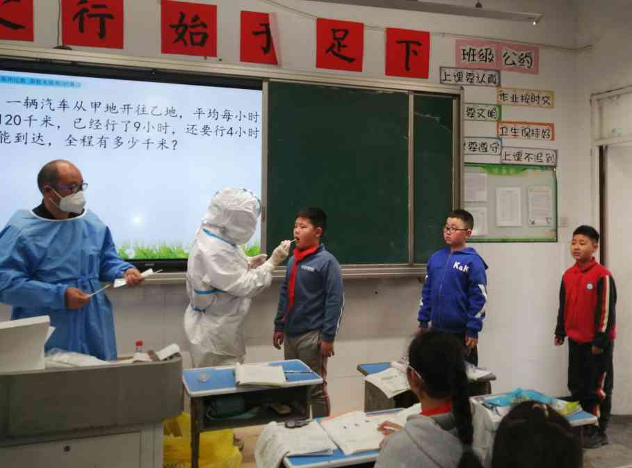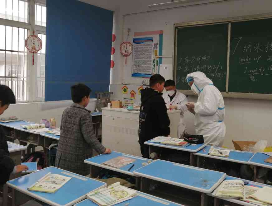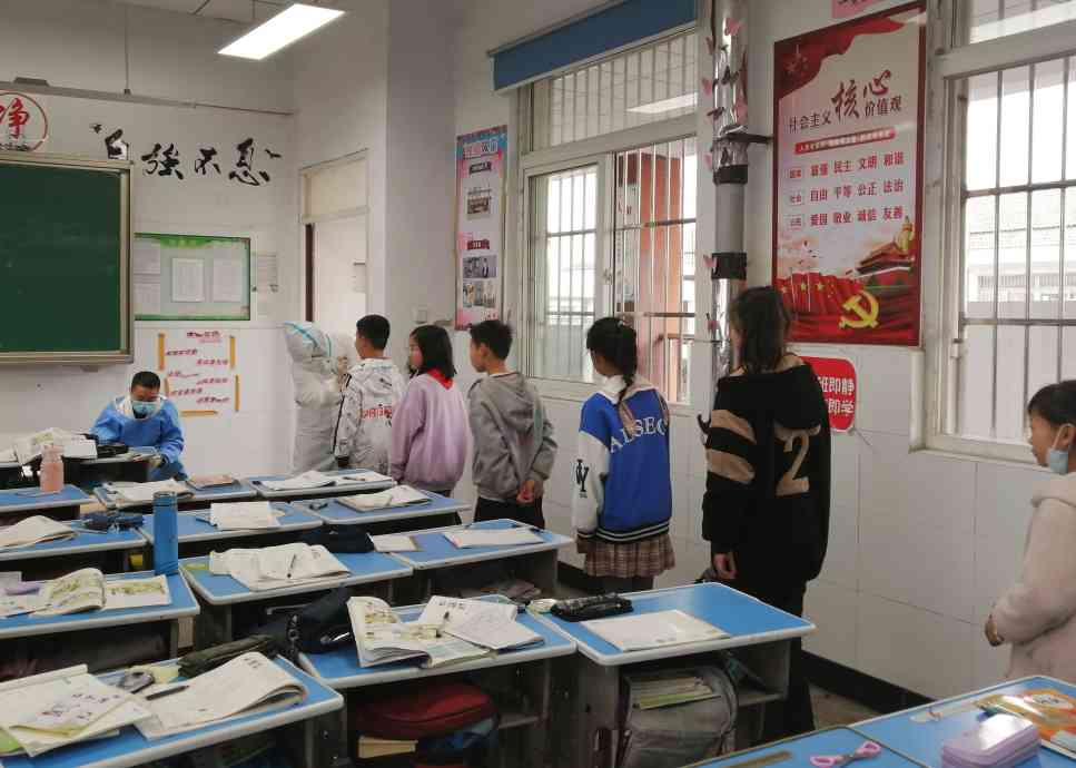 ~ 下午2:10,炉桥镇医院医务人员到达校园,他们全身“武装”,穿戴防护服,在学校安全办的精心部署下,分小组分楼层进班开展核酸检测。在各班班主任或当班教师的配合下,同学们保持一米距离,有序地排好队,严格遵照医务人员的要求,配合核酸检测取样。学生抽检结束后,医务人员又对全校教职工、安保人员等一一进行了核酸检测。