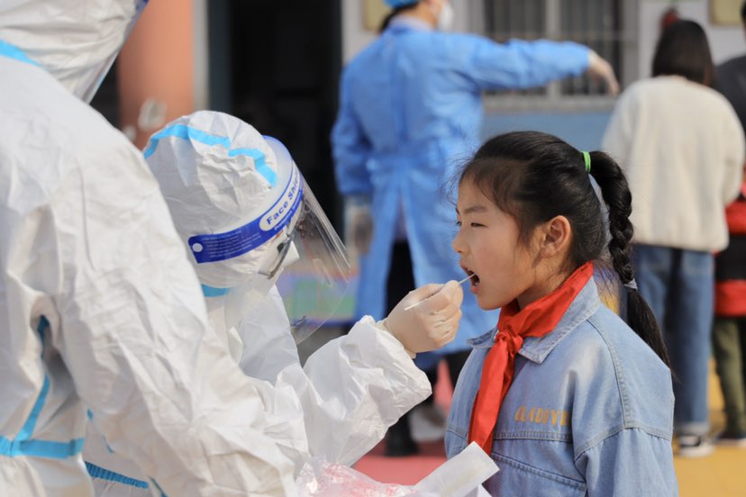 “小朋友,别紧张,来张开嘴,啊……”在核酸检测时,遇到紧张的同学,医护人员贴心的安抚着他们。3月16日上午,定远县池河镇回民小学正在操场上组织师生开展第二轮全员核酸检测工作。