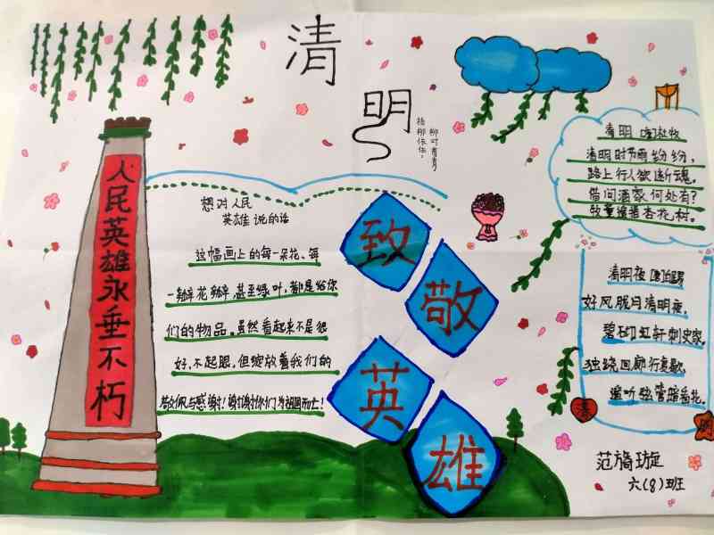~ 该校少先队发布了“文明祭扫”倡议书,同时利用国旗下讲话、校园橱窗、学校微信公众号、电子显示屏进行积极宣传,营造了“健康祭扫、安全祭扫、文明祭扫、绿色祭扫”的氛围。各班级召开了“倡导文明祭祀厚植爱国情怀”主题队会,中队辅导员向少先队员介绍了“清明节”的历史由来、传说故事、节日习俗等内容。该校政教处和少先队组织少先队员开展“网上祭英烈”活动,为先烈们献花、写留言,用实际行动表达对先烈的缅怀和哀思。高年级的少先队员设计了精彩纷呈的手抄报和黑板报。有的同学在其中表达对先烈的敬仰;有的叙述清明节的习俗和谚语;有的书写和清明节有关的古诗词;有的表示要珍惜今天的幸福生活、发奋学习。一幅幅图文并茂的手抄报和黑板报体现了少先队员对祖国优秀传统文化的继承和发扬。