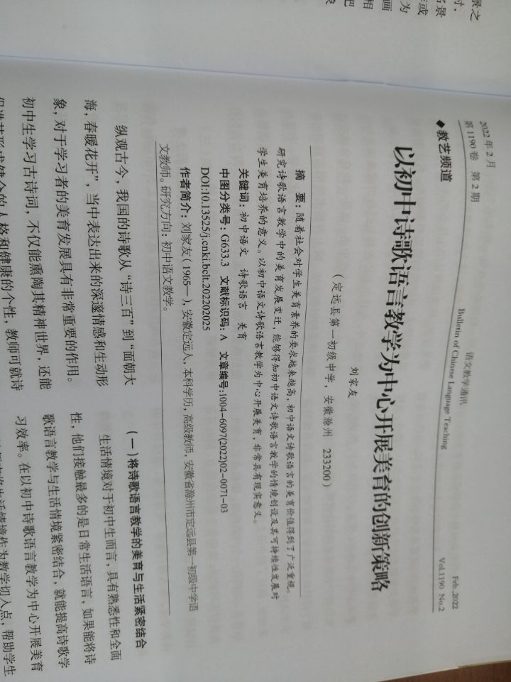 ~ 定远县第一初中教育集团双塘中学校区刘家友老师撰写的论文《以初中诗歌语言教学为中心开展美育的创新策略》在《语文教学通讯》2022年2月总第1190期发表,是该集团语文教研组在《语文教学通讯》期刊上首次发表的语文教学论文。