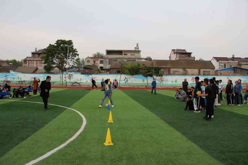 ~ 安徽省第十五届运动会将于2022年4月到9月在滁州举行,为了营造浓厚、向上的氛围,检验“双减”政策在学校落实效果,4月16日下午,池河中学七年级举行绕杆趣味足球活动,本次比赛由政教处和七年级组共同组织开展的,共有5个班级共50名(每班男女生各5名)选手参加了比赛。