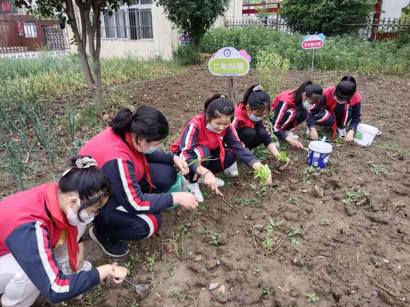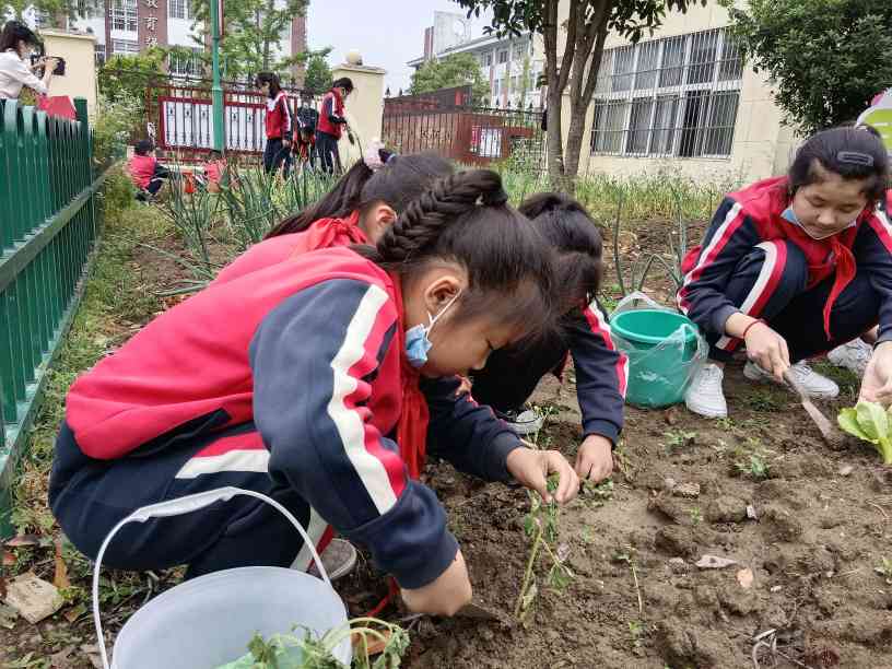 ~ 孩子们在老师的指导下,把菜园搬进校园,从家里拿来菜种,亲手种下菜苗,按照分工与各组带队老师投入到劳动实践中去。在“开心农场”里,到处都活跃着勤劳的“小蜜蜂”:孩子们先将翻好的土整平,在老师的帮助下把菜苗移植在土壤上,细心的孩子用手中的小耙子将土轻轻盖在菜苗周围,一一浇水。孩子们在“做”中学,亲历种植的全过程。在实践中充分体验了劳动的艰辛和快乐,了解了很多农业知识。