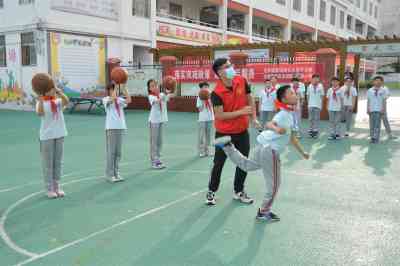 社区助学支教志愿者在指导学生如何拍球和投篮