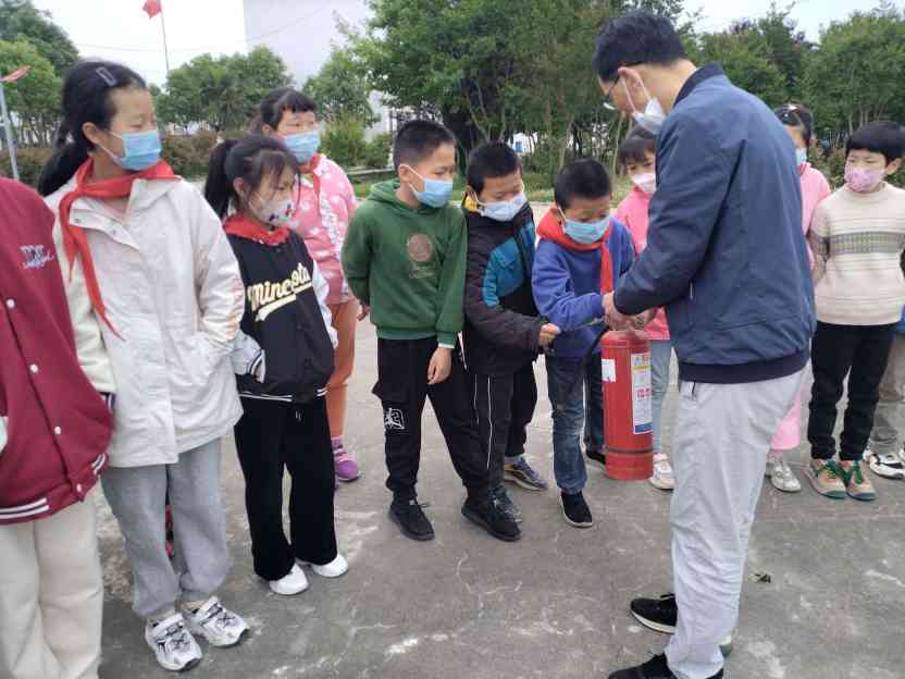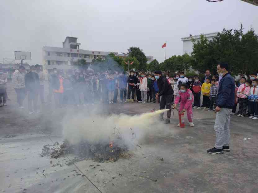 ~ 地震安全演习结束后,班主任组织学生来到操场进行消防知识学习。安全办主任齐家富亲自上阵,给孩子们演示灭火器的用法,并指导学生代表使用灭火器对准火苗根部进行灭火。