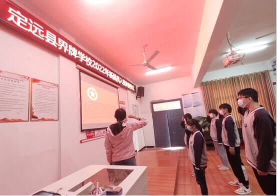 界牌学校团委举行了2022年新团员入团仪式。界牌学校校长校长代锋利、团委书记贾国兰和入团积极分子、预备团员及新老团员参加此次仪式。