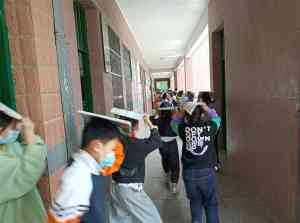 上午10:30左右,一阵急促的警铃声响起,正在上课的学生迅速蹲下,躲在课桌旁,用书包或书本保护头部。约30秒后,各班学生成两列纵队,在班主任、楼道护道员的指引下有序、快速地撤离到学校操场。各班老师清点并上报学生人数。在确保全体师生疏散到安全地点后,学校安全负责人对本次演练活动作了点评。