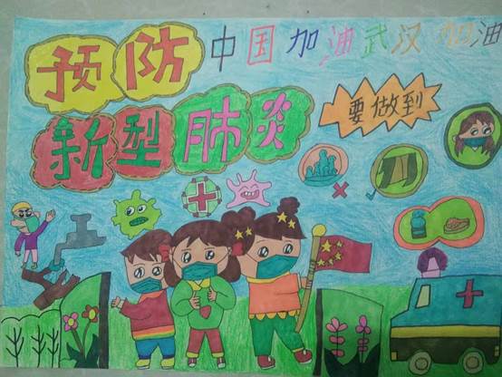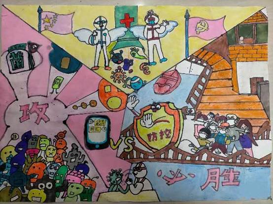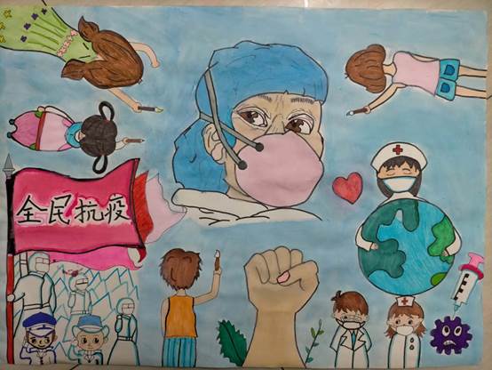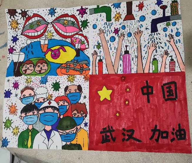 老师们利用班级微信群、钉钉群引导同学们创作反映抗击新冠肺炎疫情的绘画美术作品。宅在家里的同学们拿起了手中的画笔记录下这个特殊的时期,他们用手中的画笔告诉大家做好疫情防护措施,用手中的画笔在纸上画下了医护人员辛苦工作的身影,为武汉加油、为中国加油!(单新成)
