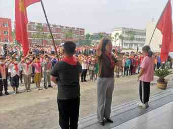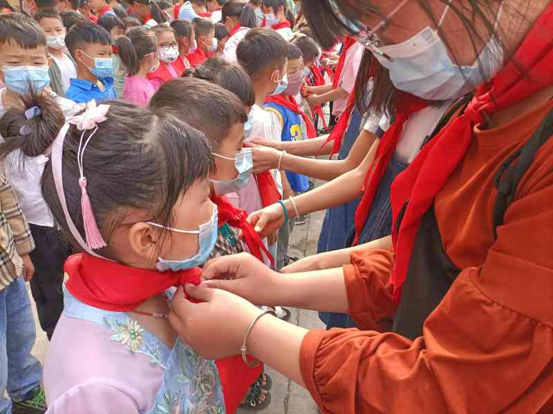 ~ 老队员们郑重地为新队员们系上鲜艳的红领巾,新队员个个神采奕奕,与老队员互敬队礼。礼毕之后, 在庄严的队旗下,全体新入队的同学们在大队辅导员王华平老师的带领下,高举右手,庄严宣誓:“我热爱中国共产党,热爱祖国,热爱人民,好好学习,好好锻炼,准备着为共产主义事业贡献力量”。
