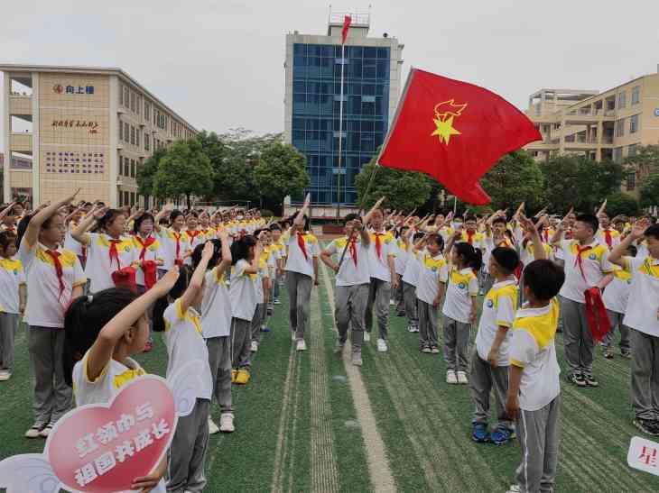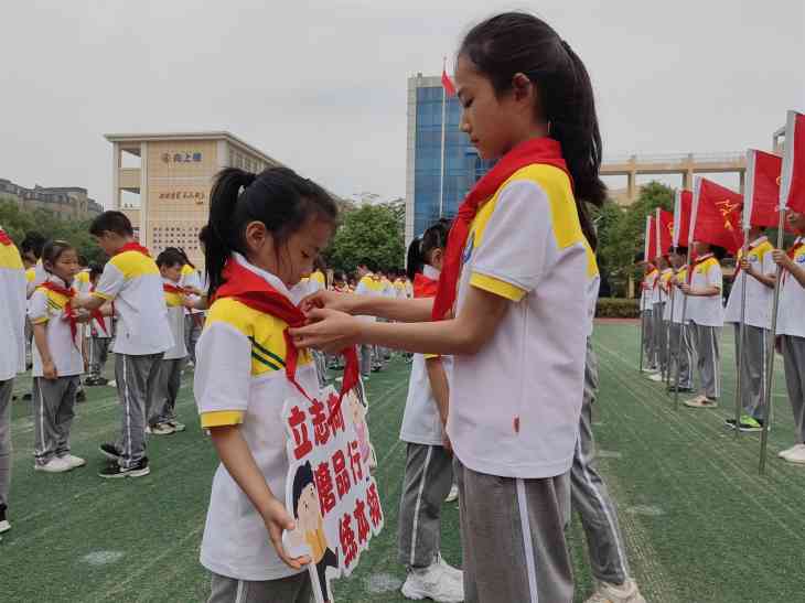 活动在嘹亮的少先队出旗曲和护旗手们整齐的步伐中拉开帷幕,少先队员敬队礼、唱队歌,用歌声表达对少先队组织的热爱。大队委员会宣读了组建一年级少先队组织的决定和新队员名单,老队员们为新队员系上鲜艳的红领巾,新队员代表铿锵有力的宣誓响彻操场。活动中,团县委负责同志向少先队员们致以最衷心的祝贺,学习传达了习近平总书记在庆祝中国共青团成立一百周年大会上的重要讲话精神,对孩子们提出树立远大理想抱负、培养优良道德品质、掌握过硬文化本领、努力塑造强健体魄等期望,对广大少先队辅导员和老师提出殷切希望和明确要求。示范性入队仪式,让每一位新入队的少先队员感受到了自己的光荣,记住了这个难忘的六一。