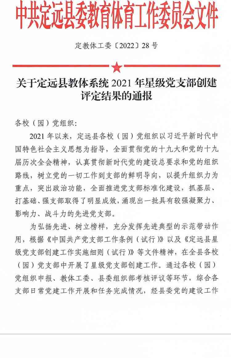 ~ 近日,中共定远县委教育体育工作委员会公布了教体系统2021年度星级党支部创建评定结果,定远县第一初中教育集团党支部再次被评定为“五星级党支部”,这是对该校党组织工作的充分肯定,也是激励该校全体党员努力继续前行的动力。