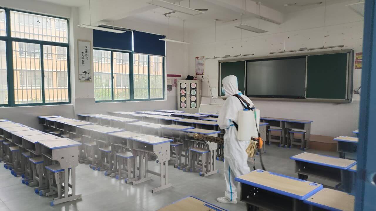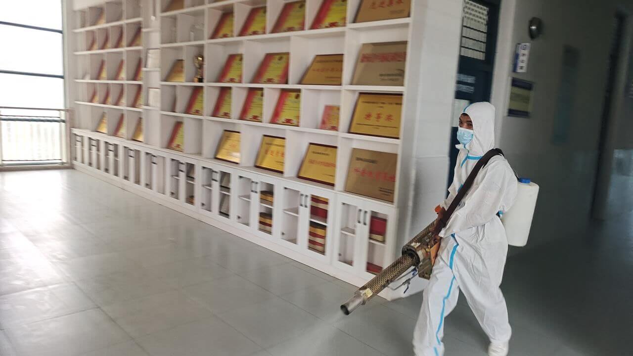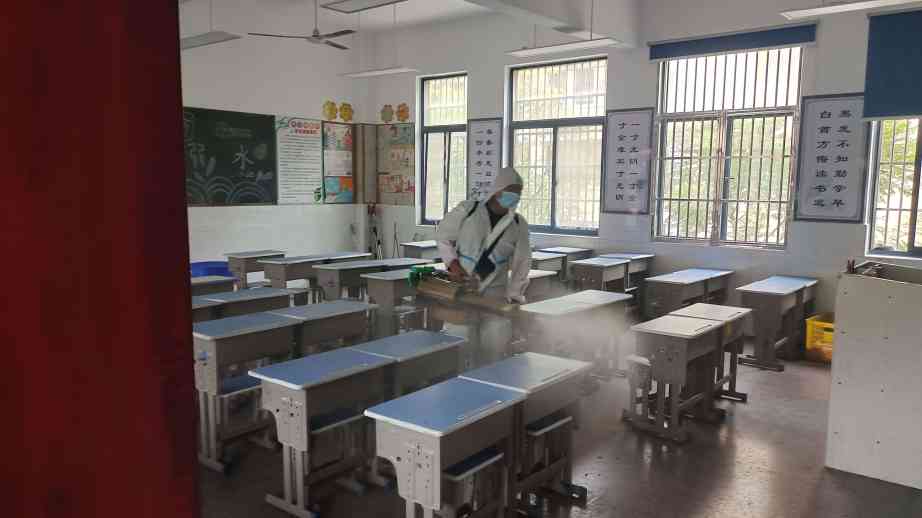 消杀现场,队员们戴着防护口罩、身穿防护服,带着消杀设备,严格按照消毒管理的标准规范操作,采用“地毯式”的消杀方式,对校园的门卫室、教室、功能室、办公室、廊道、楼梯、厕所、操场等场所进行全面彻底的喷洒消毒。