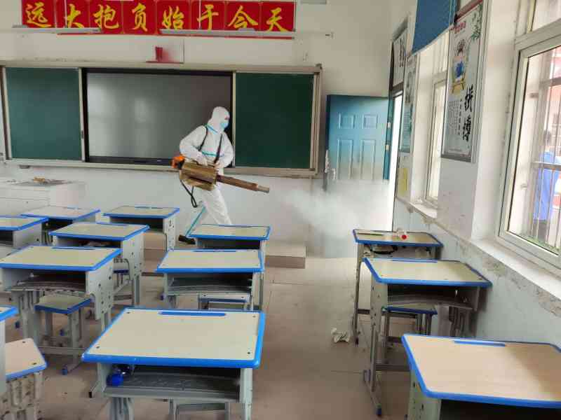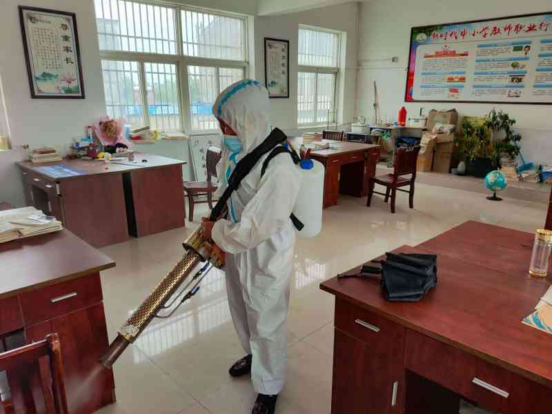 ~ 在消毒过程中,蓝天救援队的队员们身穿消毒防护服,佩戴手套、防护口罩 ,肩扛专业的消杀设备,严格按照卫生消毒管理的标准规范进行操作 ,对学校所有教室、办公室、楼梯走廊、学生公寓、厕所等进行了 “全方位、全覆盖”的消毒,做到不留死角、不留盲区,为师生即将平安返校保驾护航。