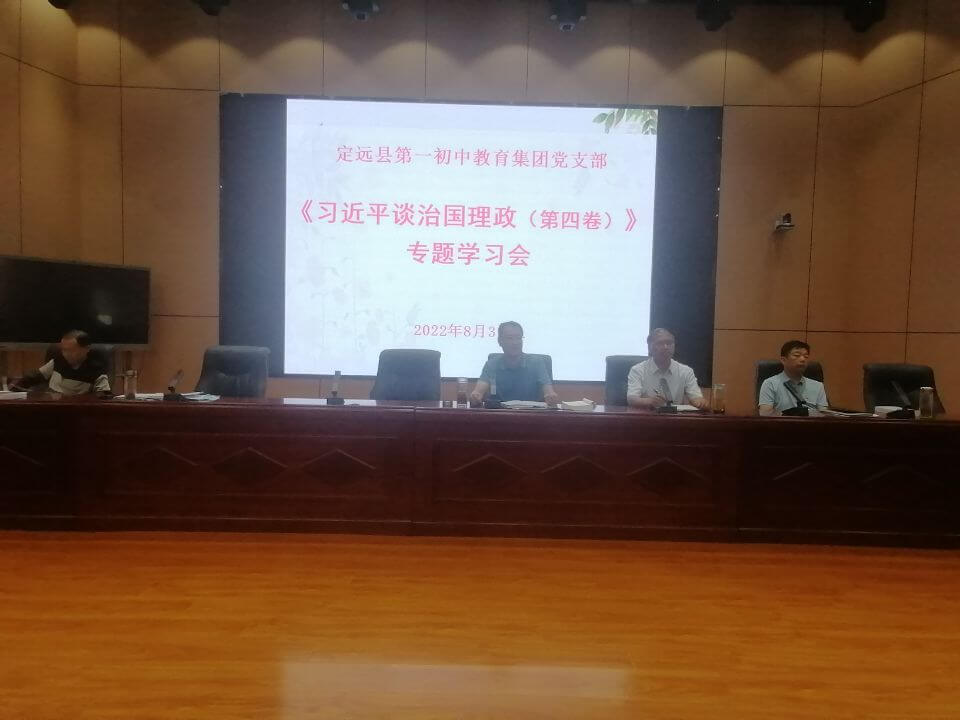 ~ 8月31日,定远县第一初中教育集团党支部在双塘中学校区报告厅组织学习会,认真学习《习近平谈治国理政》第四卷,促进全体党员增强“四个意识”,坚定“四个自信”,做到“两个维护”,捍…