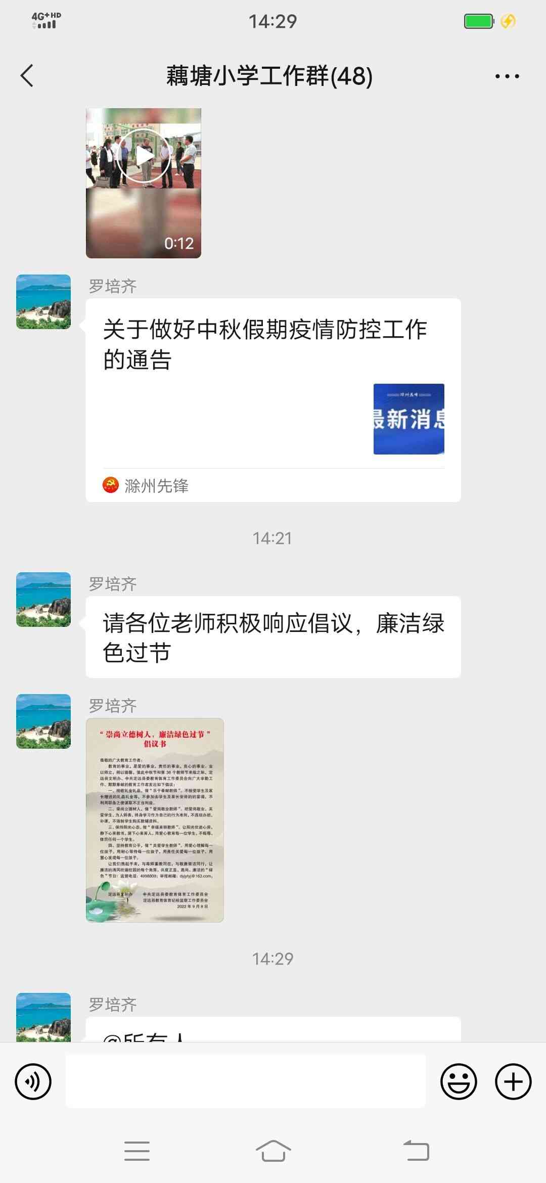 长空鸣雁秋时至,桃李春风又一年。又逢金秋九月,老师们迎来了第38个教师节。为加强师德师风建设,推动崇尚师德、廉心正行的良好风尚,让老师们度过一个健康、温馨、廉洁的节日,近期,定远县藕塘小学积极开展“绿色教师节”倡议主题活动。