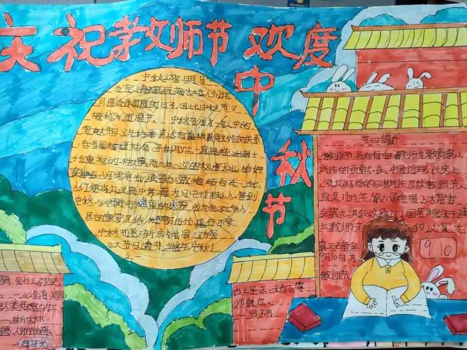活动中,在大队辅导员的引导下,高年级组开展了双节主题手抄报比赛活动,同学们以喜迎中秋、感恩教师为主题,纷纷挥笔泼墨,献上自己宝贵的才艺。此外,各班级还组织少先队员开展了一期以“庆祝教师节、欢度中秋节”为主题的黑板报活动。