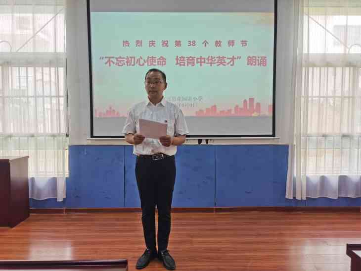 活动二:9月9日下午3:00,花园湖小学 “不忘初心使命 培育中华英才”教师节诗歌朗诵会拉开帷幕。本次诗歌朗诵分小学和幼儿园两组,内容凸显教师平凡又伟大的职业特点,三十余名少先队员代表聆听。他们的朗诵或铿锵有力,或激情洋溢,或宛若山涧缓缓流动的小溪,淋漓尽致地抒发了对职业的热爱之情和对祖国深沉爱恋,娓娓道来,涤荡人心、令人振奋,无不彰显着新时代青年爱国爱党,爱岗敬业的底色。活动中,陈子健老师结合自身实际声情并茂地朗诵了诗歌《我骄傲,我是一名人民教师》,表达身为一名教育工作者的无悔誓言。朗诵活动的举办,进一步增进了师生感情,提高了教师从教的获得感和荣誉感。