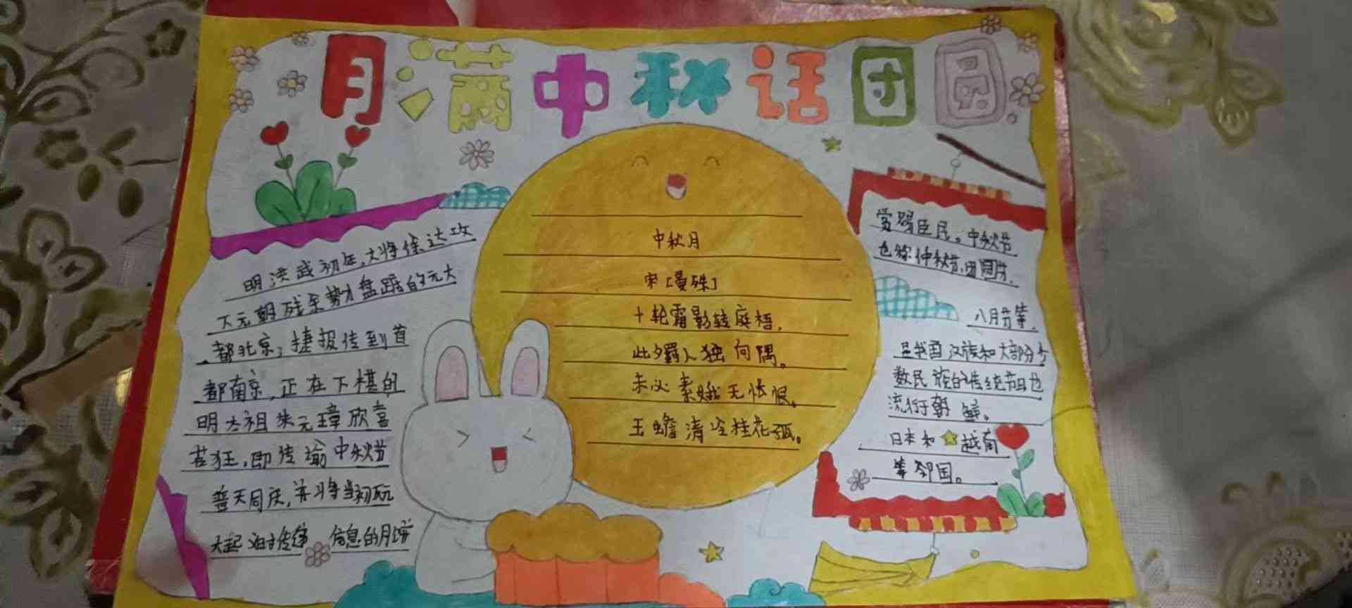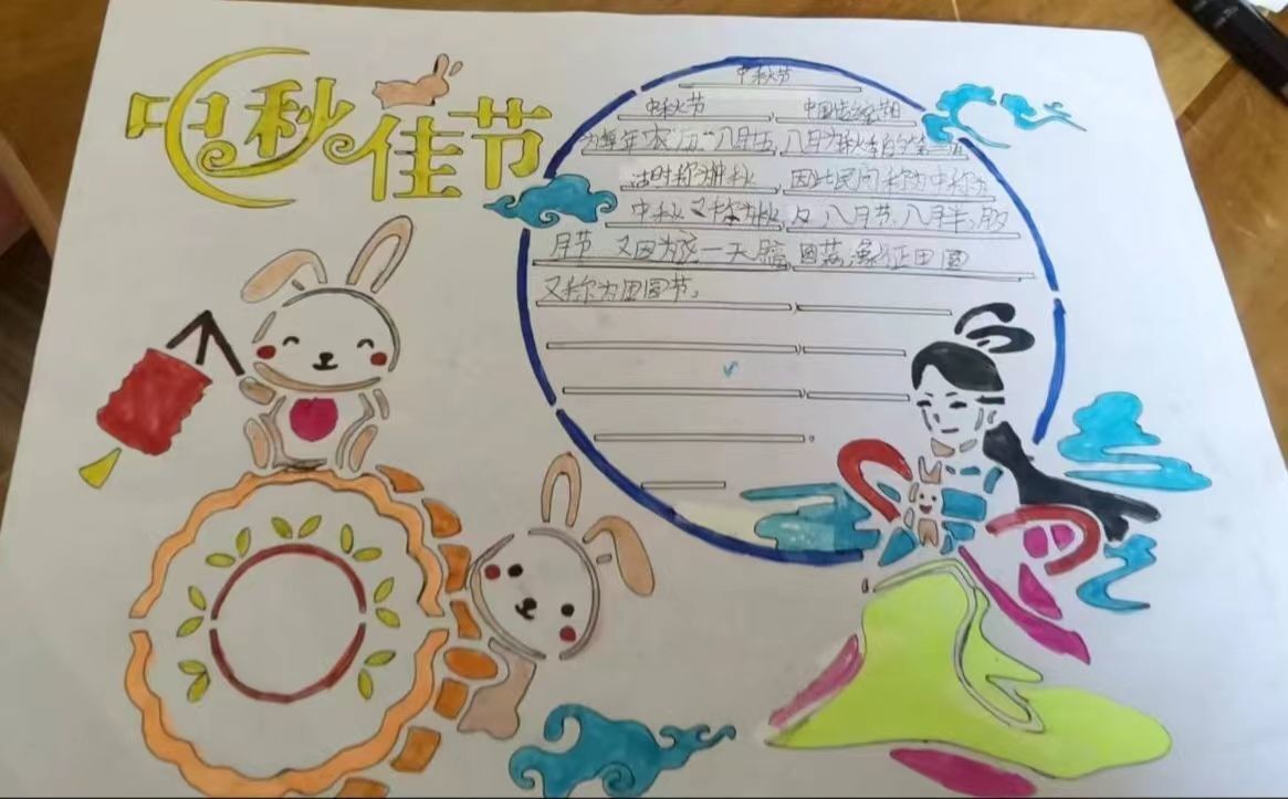~ 各班搜集与中秋节有关的故事、文章、诗歌、歌曲,举行一次“我们的节日.中秋”主题班会。同学们化身故事大王、小诗人纷纷站上讲台讲述有关中秋节的传说,朗诵与中秋有关的诗歌、文章。