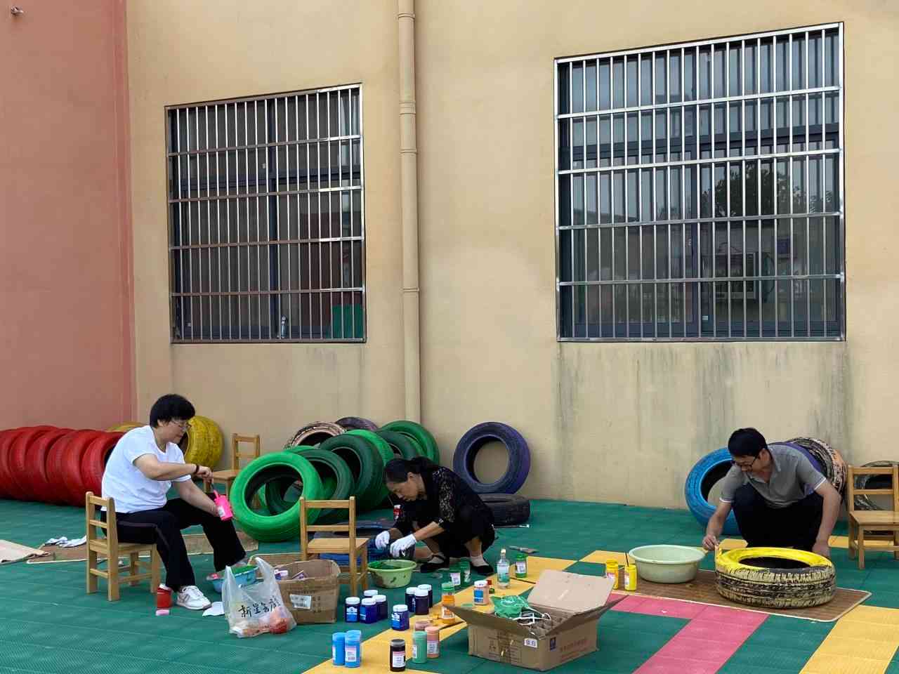 ~ 为确保活动顺利完成,胜利学校幼儿园进行了详细部署,对各个不同场所做了分工,以小组合作的形式对园内园外进行彻底清理。活动中,教师们齐心协力、相互合作,铆足干劲,对各个活动室地面进行冲洗,清除了墙体灰尘,清洗了大型玩具,并对卫生间全面清洁,做到不留死角、不留盲区。在环境整理的同时安排部分教师对幼儿园各个活动室做了精美的布置,并对室外褪色器材做了无污染上色。