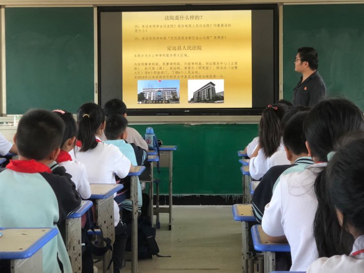 随后,定远法院法官以“法润校园  守护少年的你”为题,用图文并茂的PPT形式,向同学讲解了法院的基本构成,以及在面对校园欺凌如何解决。在校园生活中日常安全防范,怎样守护我们的身体。面对网络的诱惑,学生如何避免受到不良侵害,珍爱生命,预防溺水等内容。同时,工作人员通过真实的案例,引导未成年人要遵纪守法,远离犯罪。