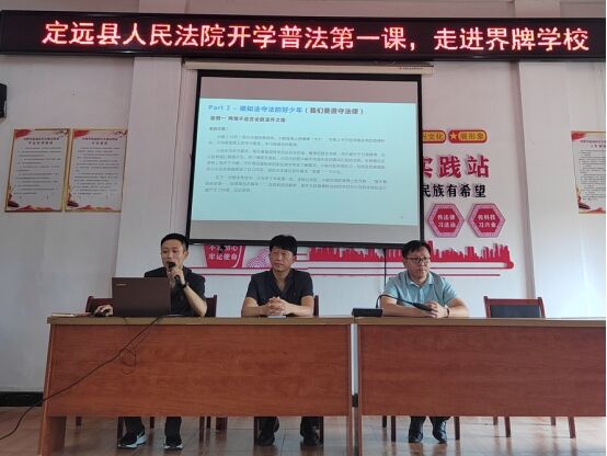 9月20日上午,定远县人民法院胡成刚庭长,马达原法官和纪姗姗书记员组成的普法教育宣讲团走进定远县界牌学校开展以《保护自己健康成长》为主题的普法教育讲座。