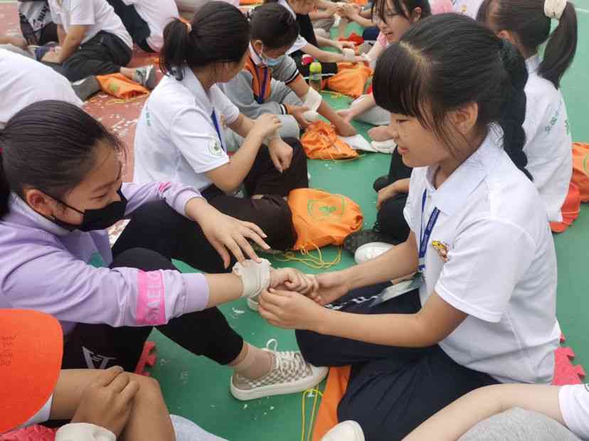 红十字急救课上,医务人员结合理论知识,与师生们分享了日常生活中常用的外伤急救措施、不同受伤部位的包扎方法,以及如何学会检伤、验伤等知识,随后,同学们踊跃“上阵”进行实操体验,救护培训师资手把手地指导,并指出在紧急救护中存在的细节问题。