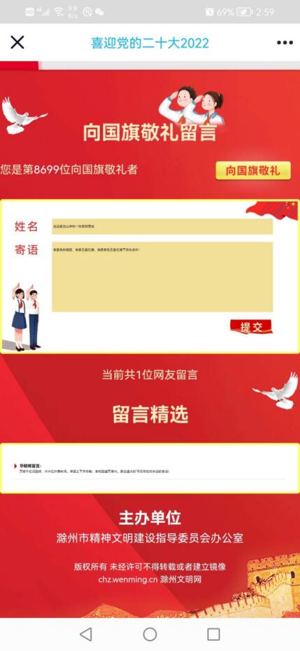 学校举行了庄严的升旗仪式,同时也拉开了“向国旗敬礼留言”主题教育活动的序幕。学校全体师生参加了本次活动。各班利用计算机教室和微信客户端,登录滁州市文明网首页“向国旗敬礼留言”栏目,进行网络寄语祝福等活动。