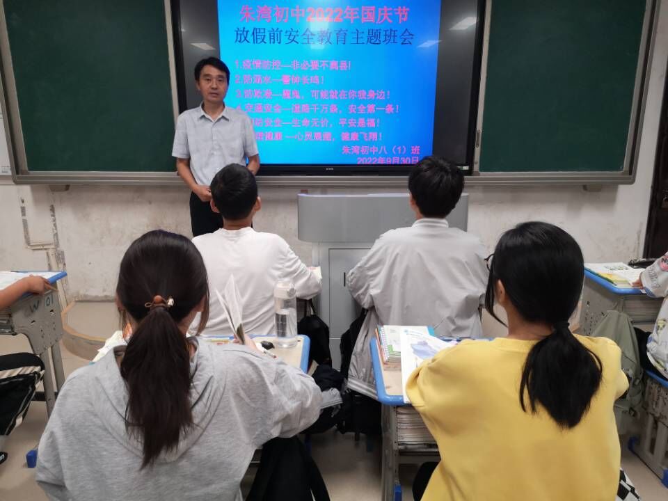 ~ 为切实提高学生国庆节假期的安全防范意识,定远县朱湾初中于近日在校安全办组织下在各班级召开国庆假期安全教育主题班会, 在主题班会上,班主任要加强疫情防控、防溺水、防电信诈骗、放欺凌、交通消防安全、食品卫生等安全知识教育。教育学生牢固树立安全意识,时刻保护自身安全。