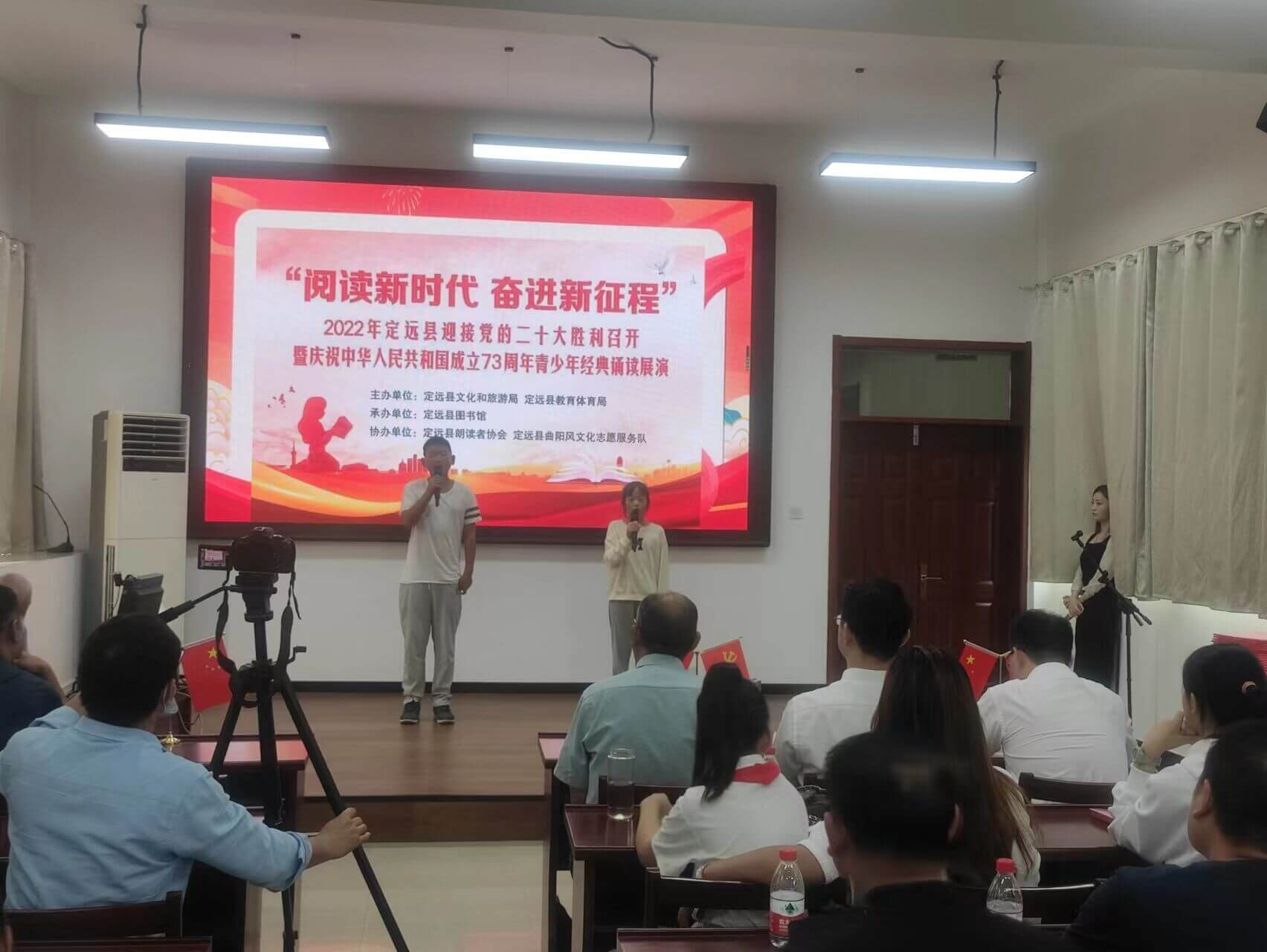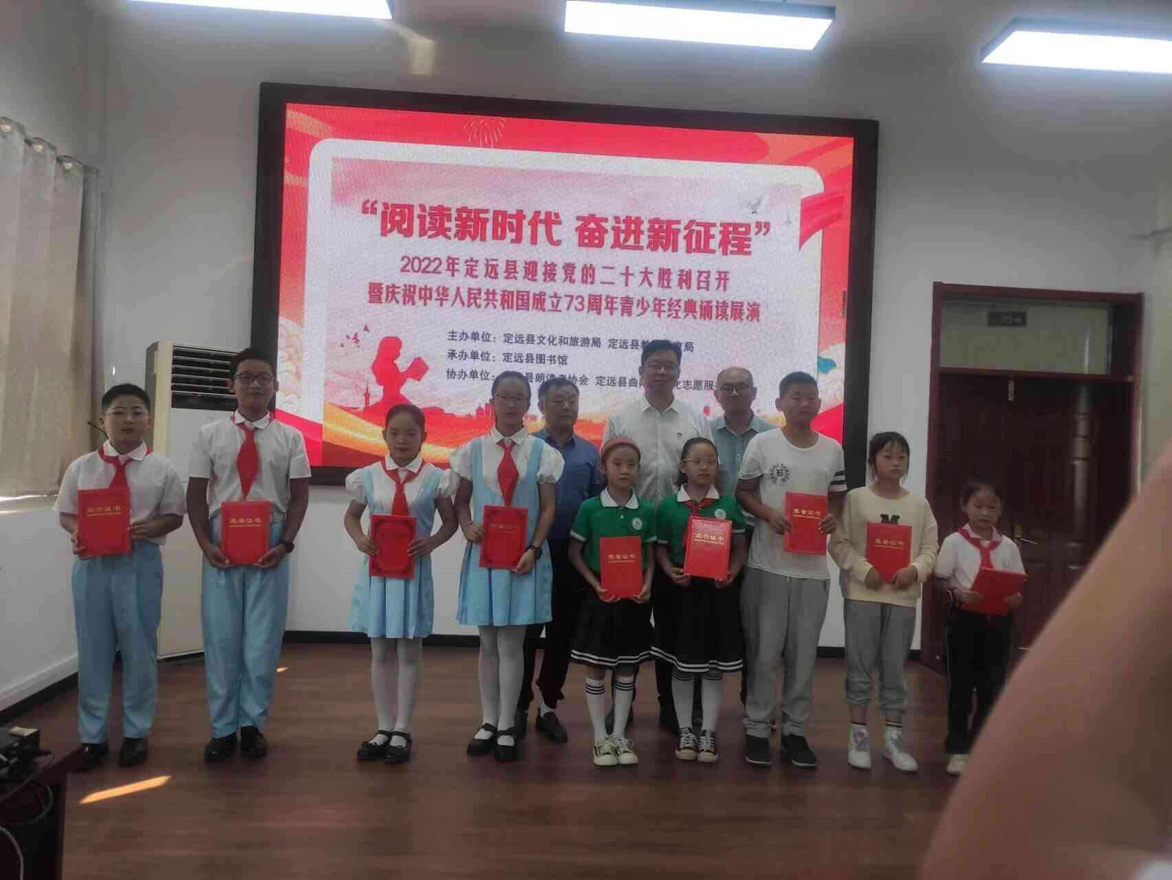 ~ 该校还积极组织学生参加“阅读新时代 奋进新征程”朗诵大赛活动,并被选到定远县图书馆参加10月1日的“庆祝中华人民共和国成立73周年青少年经典诵读”线下展演活动。孩子们深情的朗诵《我有一个美丽的祖国》,获得了在场观众经久不息的掌声。朴素的外表下,同样有着一颗红色的爱国心。此次朗诵活动激发了孩子们的阅读兴趣和爱国热情。