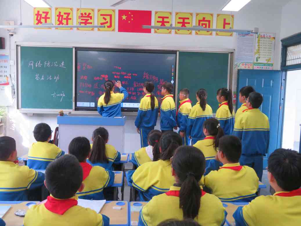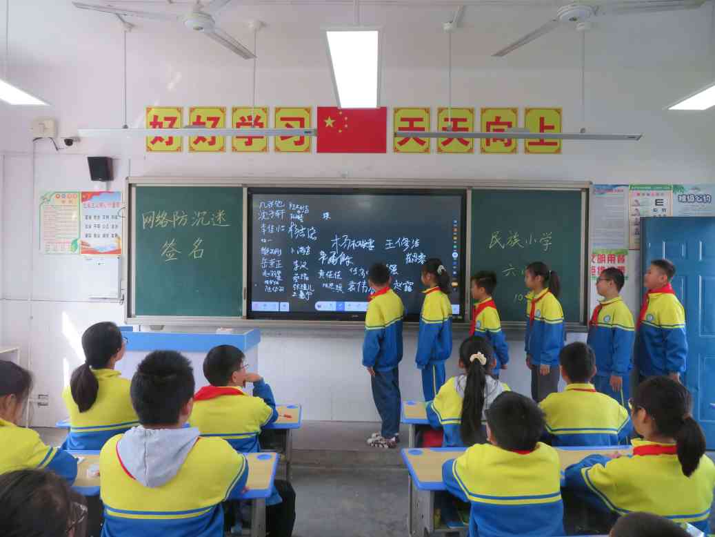 活动中,各班主任老师给同学们讲解了网络安全的知识、文明上网规范和学生沉迷网络的危害,一起朗读了《青少年网络文明公约》。最后,同学们在各班的电子白板网络防沉迷签名区郑重签上了自己的姓名。