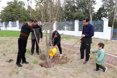 党员干部在党支部书记、校长刘继忠的带领下,兴致勃勃地忙碌起来。大家三四人一组,挥锄铲土、扶树定根、培实新土、提水浇灌,一齐动手,互相配合,合力栽下一棵棵树苗,植下一片片新绿。整个过程一丝不苟,各个环节井然有序,每道工序都做得认真细致。