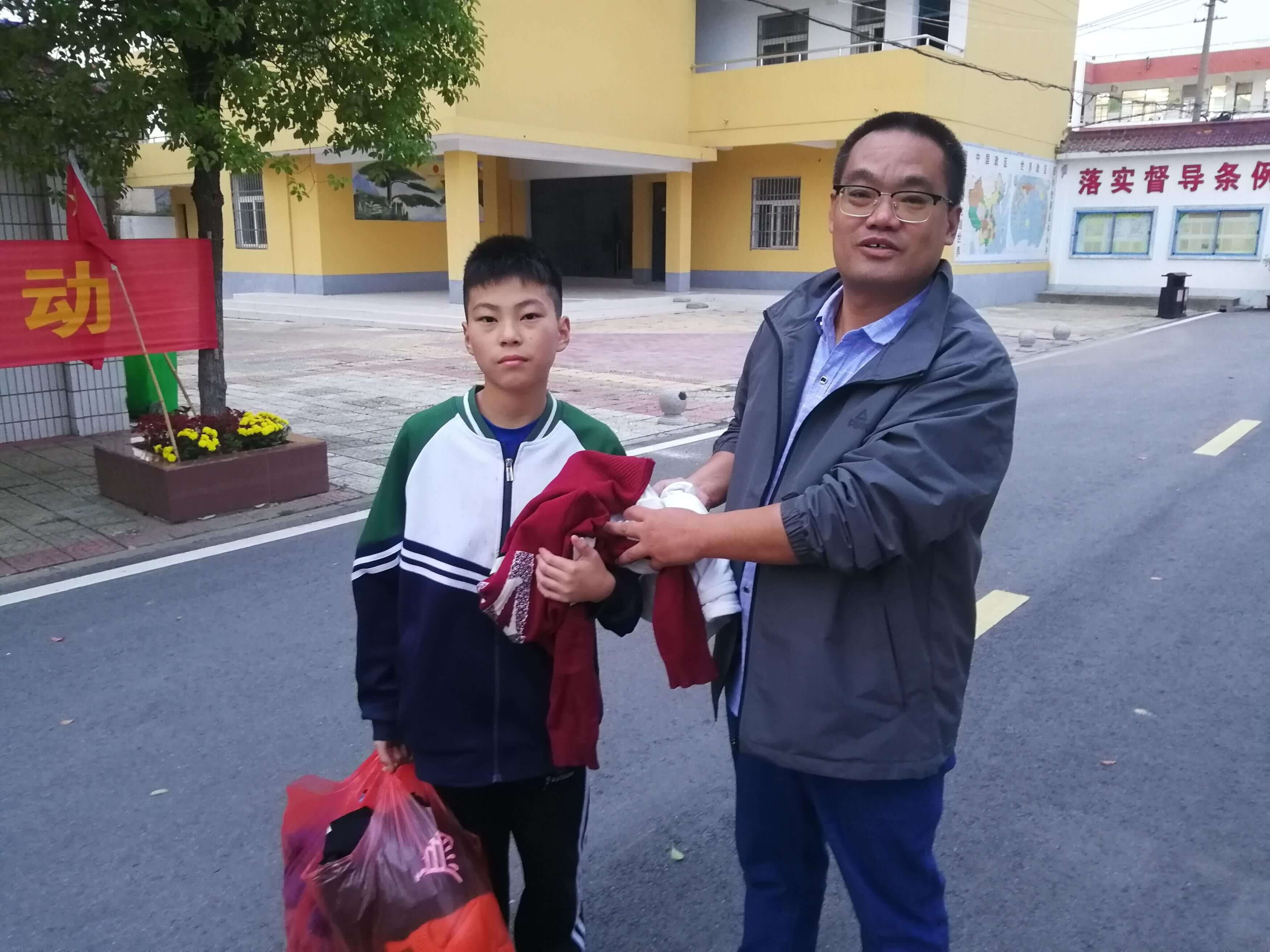 ~ 一场秋雨一场寒,十场秋雨穿上棉。连日来秋雨绵绵,气温骤降,可池河中学校园里还有个别家庭经济困难的寄宿生还穿着单薄的衣服,风里来雨里去穿梭在班级与公寓之间。这一切,定远县池河中学爱心教师李发宝看在眼里急在心里,10月8日下午课后服务时间,李老师特地从家里拿出自己孩子穿的8件洗净整洁的御寒衣物捐赠给八(3)班家庭经济困难的寄宿生窦业鹏同学,在这个秋意渐深渐凉的时刻,为孩子送上一份特别的爱,更为市级文明校园建设传递出满满的正能量。
