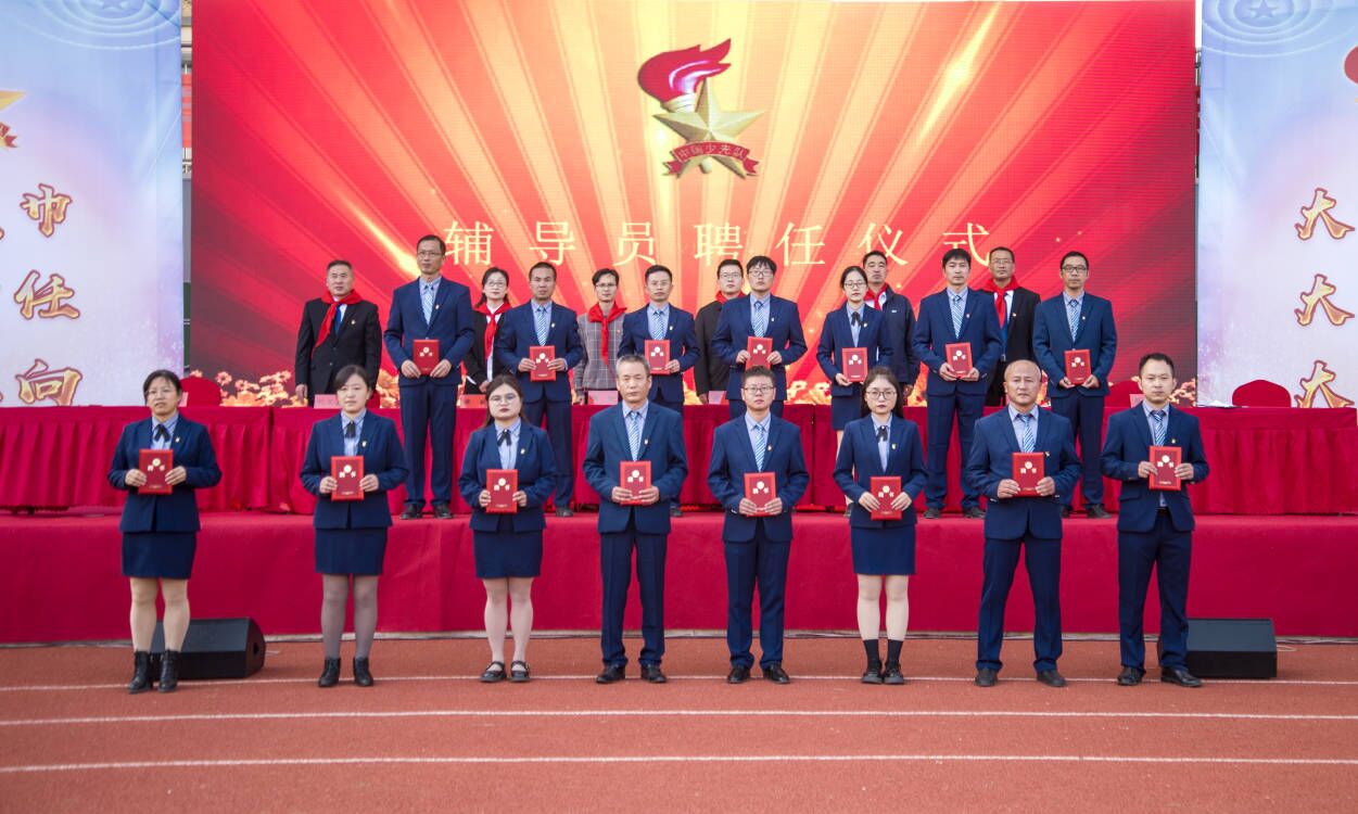 ~ 辅导员聘任仪式由集团大队辅导员刘晓燕老师主持,团县委副书记张杨致开幕词,县委教体工委委员、工会主席姜杨宣布换戴仪式开始。集团党支部书记、校长张书清宣读了各中队建队决定,到会领导为每一位新任的中队辅导员颁发了证书并授予中队旗,由辅导员代表周元东老师带领全体辅导员进行宣誓。